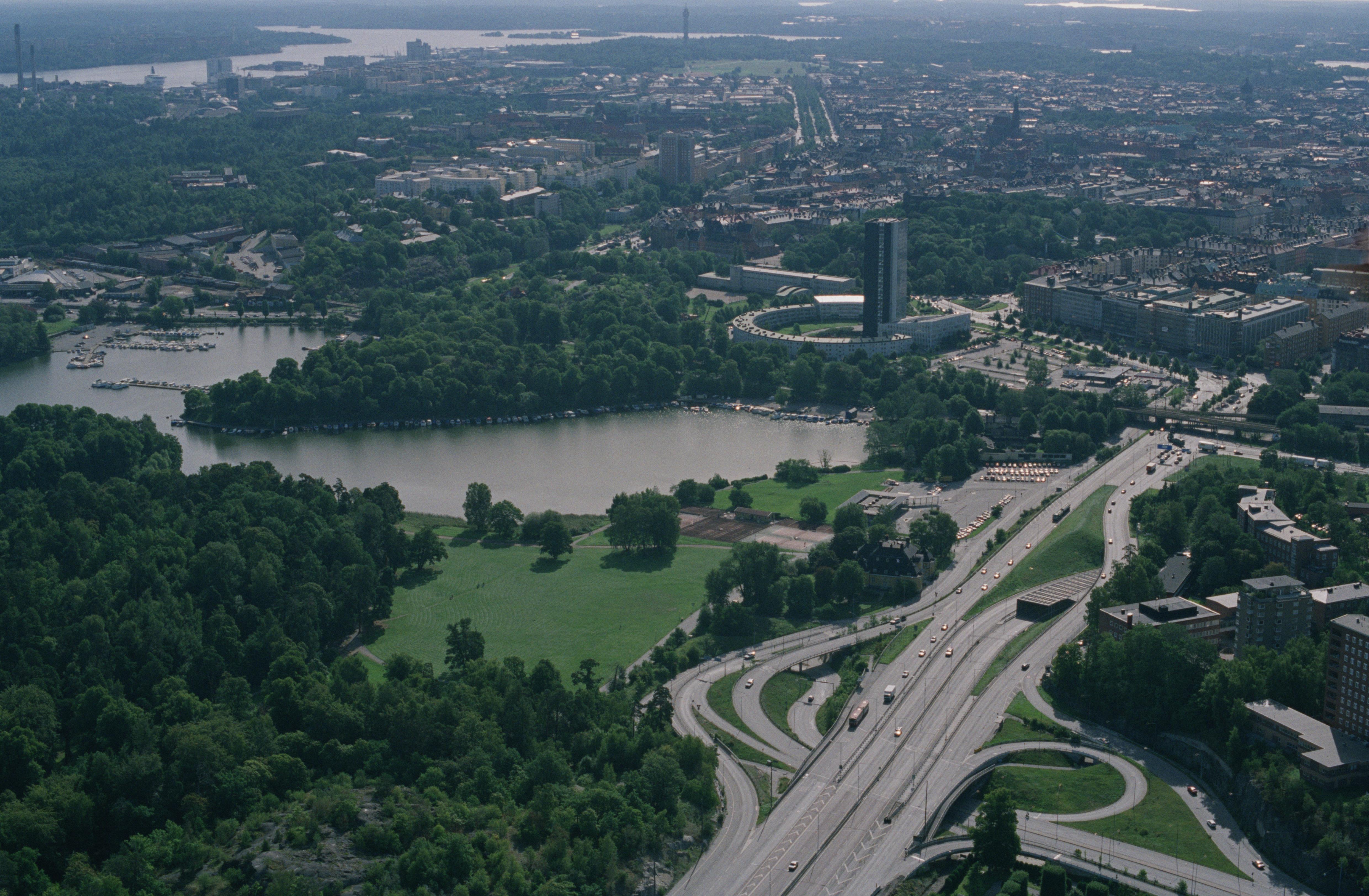 Brunnsviken vid gränsen mellan Solna (i bildens nedre del) och Stockholm (i bildens övre del). Vid bildens mitt Sveaplan och Wenner-Gren Center