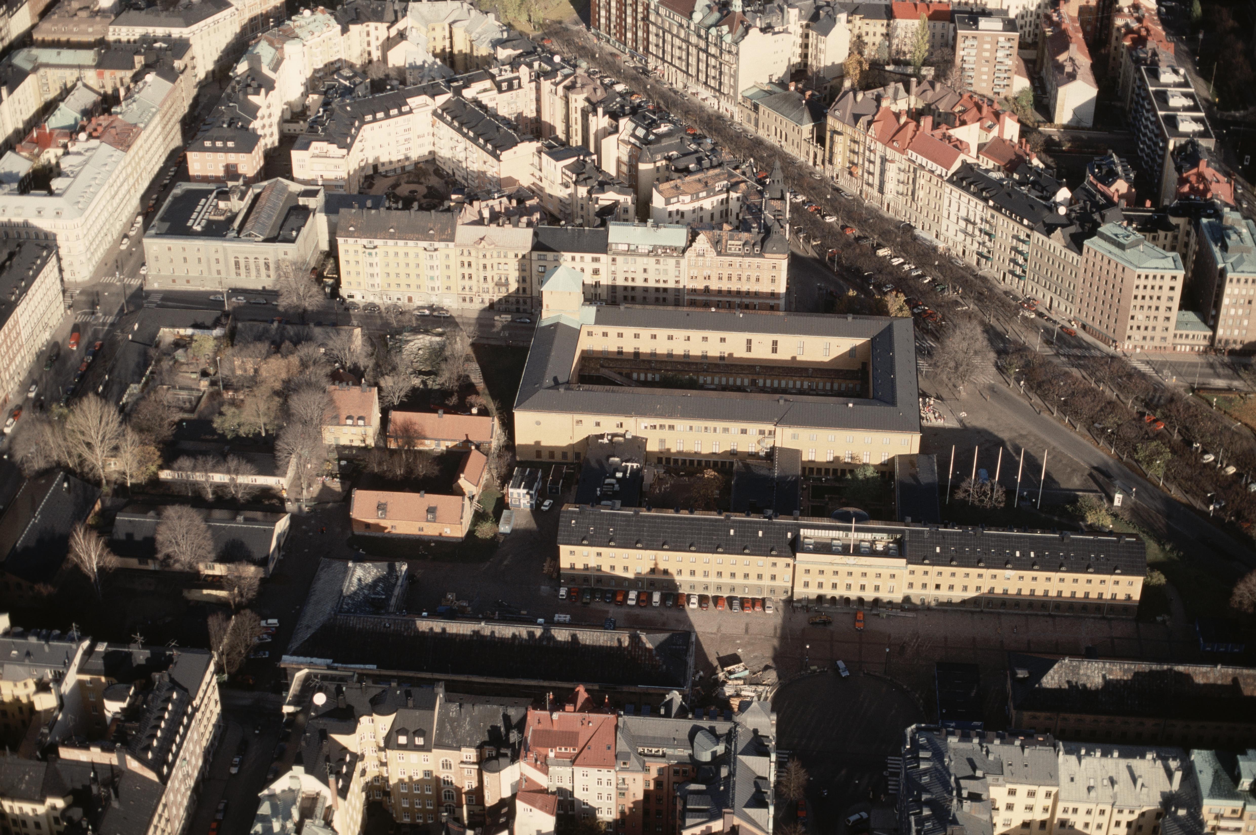 Beskrivning: Östermalm. Styrmansgatan, Storgatan och Narvavägen m.m. Kvarteret Krubban med statligt byggnadsminne Oxenstiernska malmgården - RAÄnr Stockholm 73:1 och Statens Historiska Museum (SHM), Riksantikvarieämbetet, m.m. Bilden är tagen mot (väderstreck): NNO