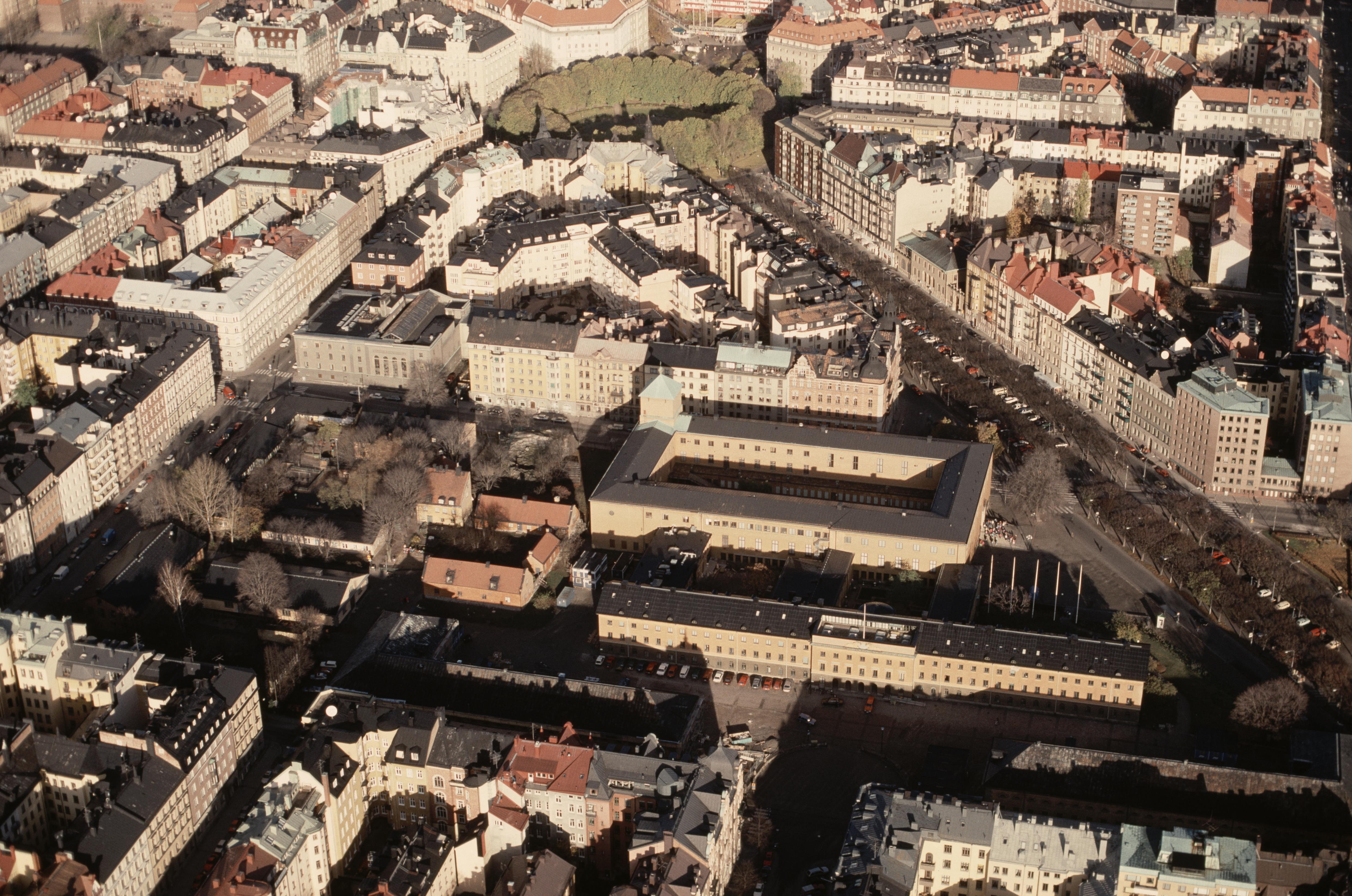 Beskrivning: Östermalm. Styrmansgatan, Narvavägen, Storgatan m.m. Kvarteret Krubban med statligt byggnadsminne Oxenstiernska malmgården - RAÄnr Stockholm 73:1 och Statens Historiska Museum (SHM), Riksantikvarieämbetet, m.m. I bildens övre del Karlaplan. Bilden är tagen mot (väderstreck): N