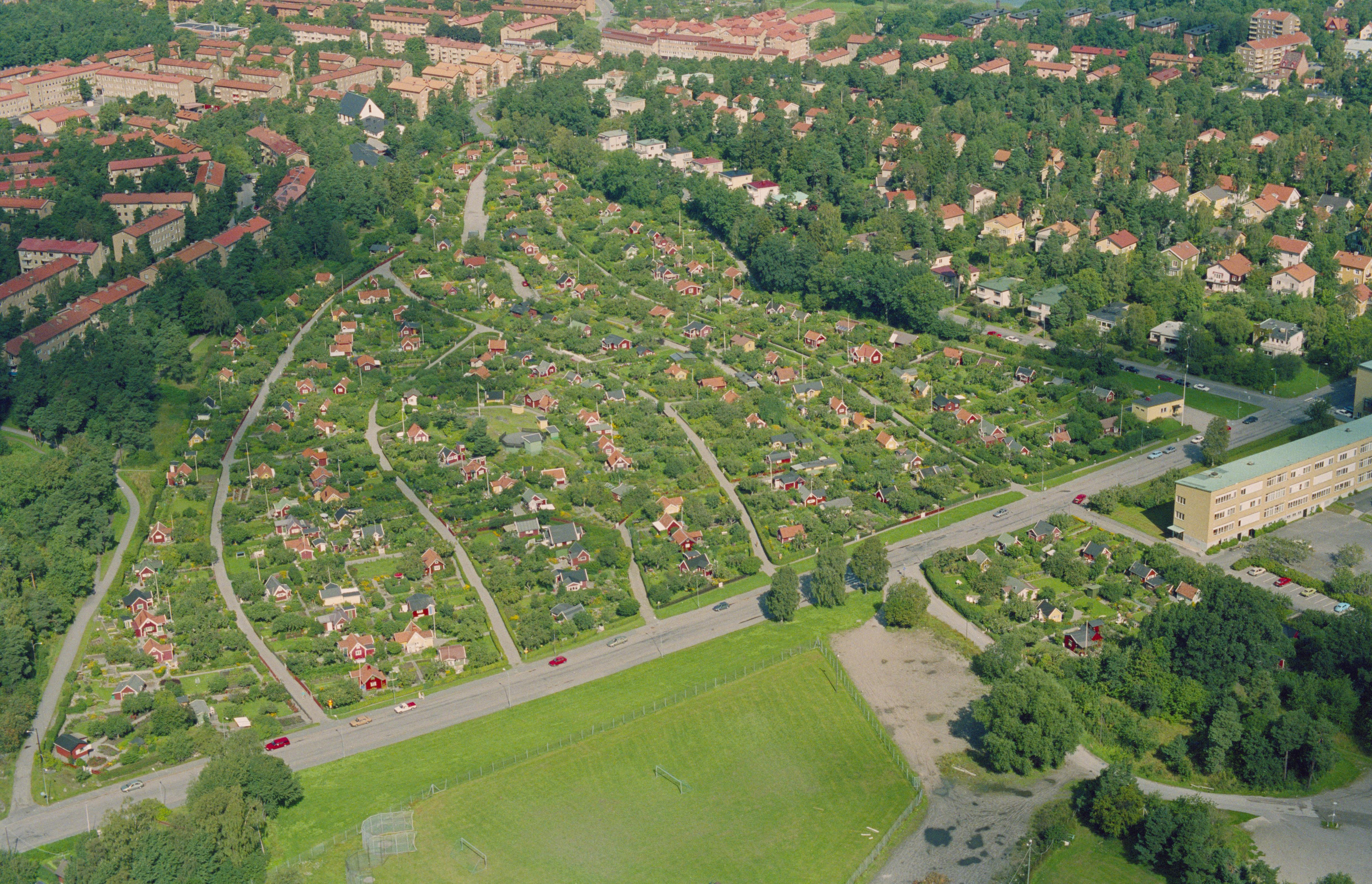 Beskrivning: Området Stora Mossen och Abrahamsberg i stadsdelen Bromma i Stockholms Västerort. Vid bildens mitt Stora Mossens koloniområde. Bilden är tagen mot (väderstreck): NV