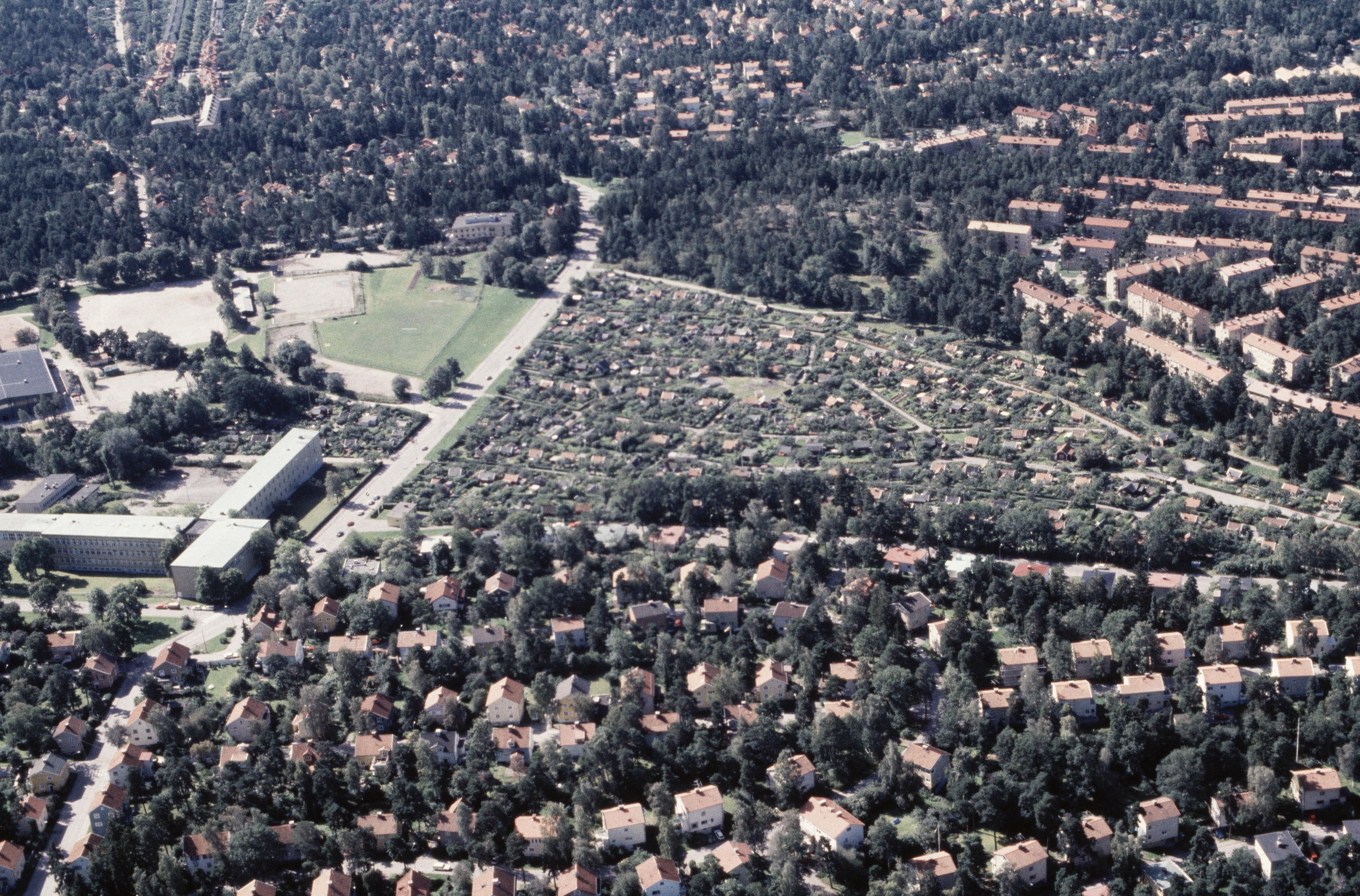 Beskrivning: Området Stora Mossen och Abrahamsberg i stadsdelen Bromma i Stockholms Västerort. Vid bildens mitt Stora Mossens koloniområde. Bilden är tagen mot (väderstreck): S