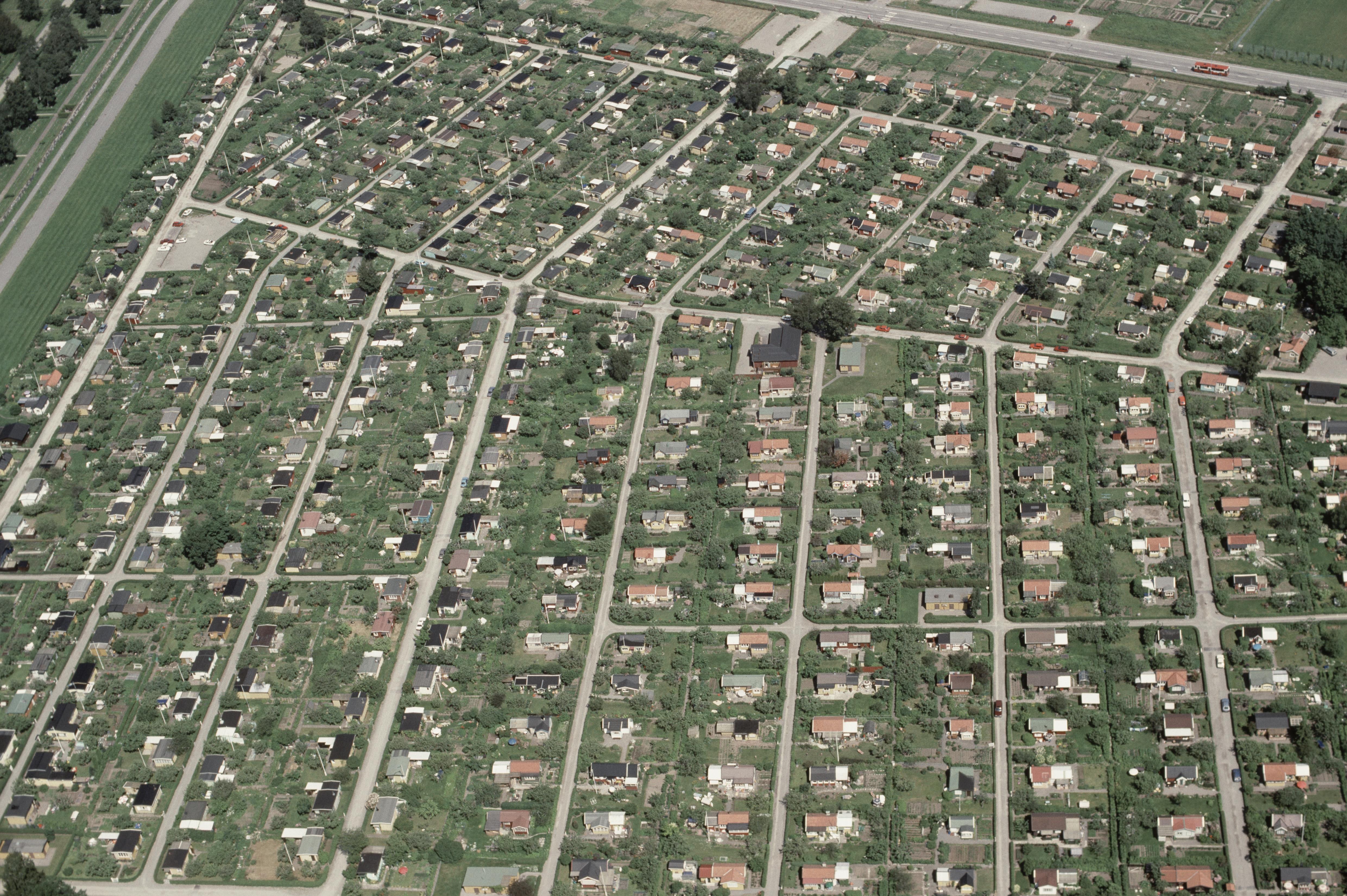 Beskrivning: Skarpnäcks kolonistugeområde vid Skogskyrkogården (skymtas uppe till vänster). Bilden är tagen mot (väderstreck): N