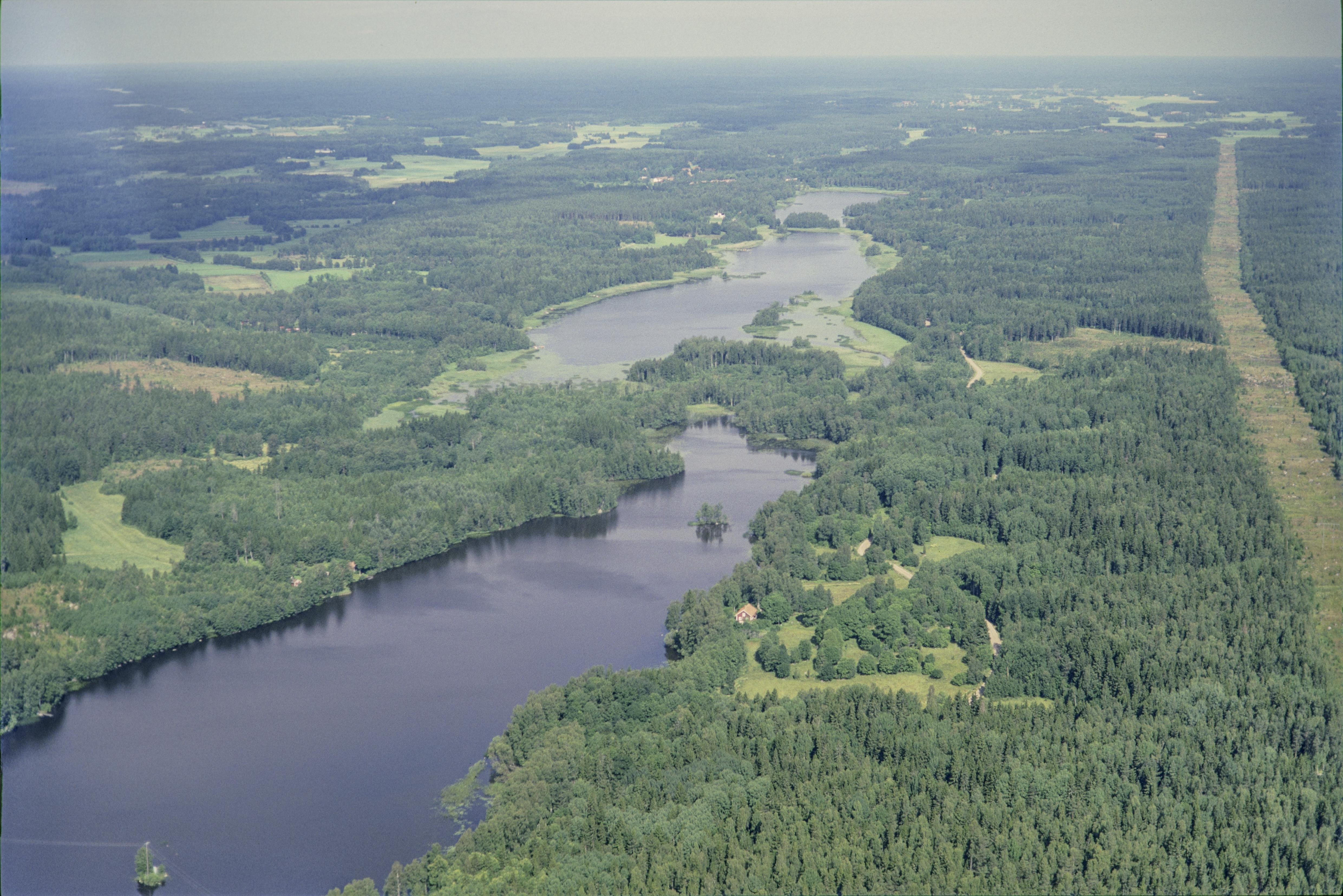 Beskrivning: Vid bildens mitt Skattbolsgrundet i sjön Närdingen. Uppe till höger i bildens övre del Skebobruk RAÄnr Ununge 127:1. Bilden är tagen mot (väderstreck): NNV