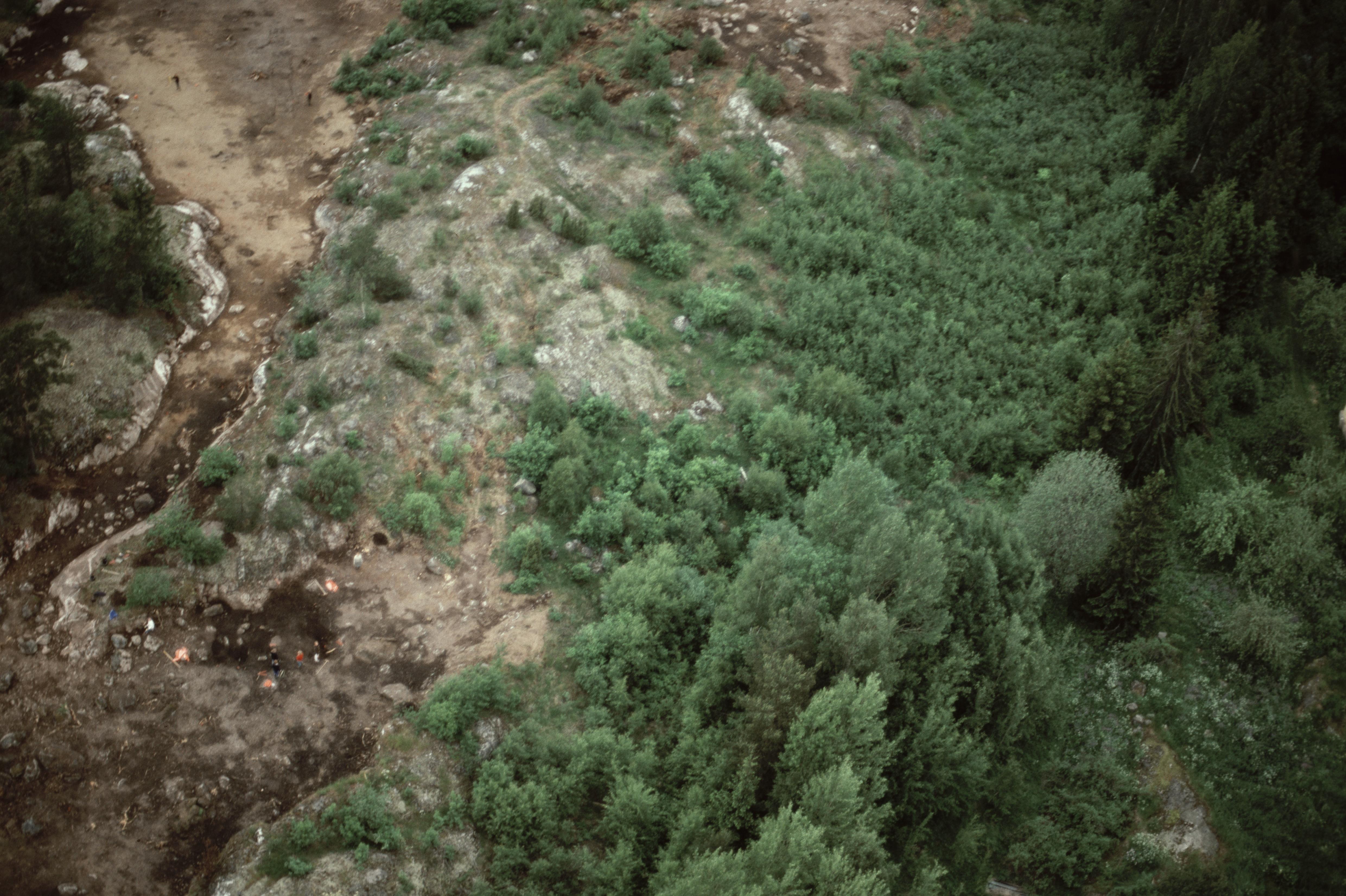 Beskrivning: Arkeologiska undersökningar innan bygge av väg E18 vid Apalle, Högsta och Pollista. I bilden Dragonbacken RAÄnr Övergran 9:1 och boplats RAÄnr Övergran 270:1 m.fl. Bilden är tagen mot (väderstreck): VNV