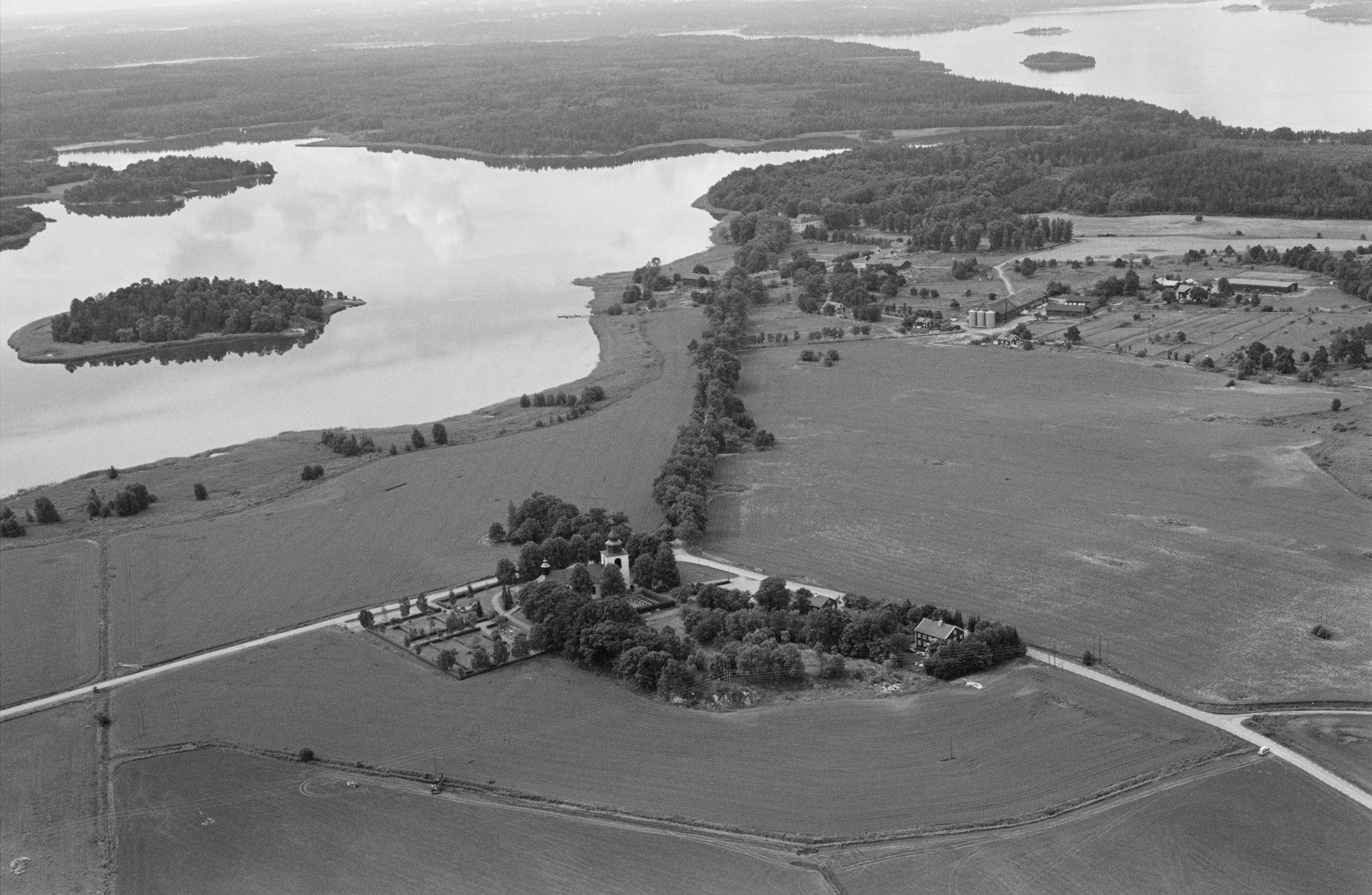 Beskrivning: Östra Ryds kyrka. I bildens övre del Rydboholms slott med Vasatornet - byggnadsminne RAÄnr Östra Ryd 70:1. Kyrkfjärden till vänster och fjärden Stora Värtan uppe till höger. Bilden är tagen mot (väderstreck): SSV