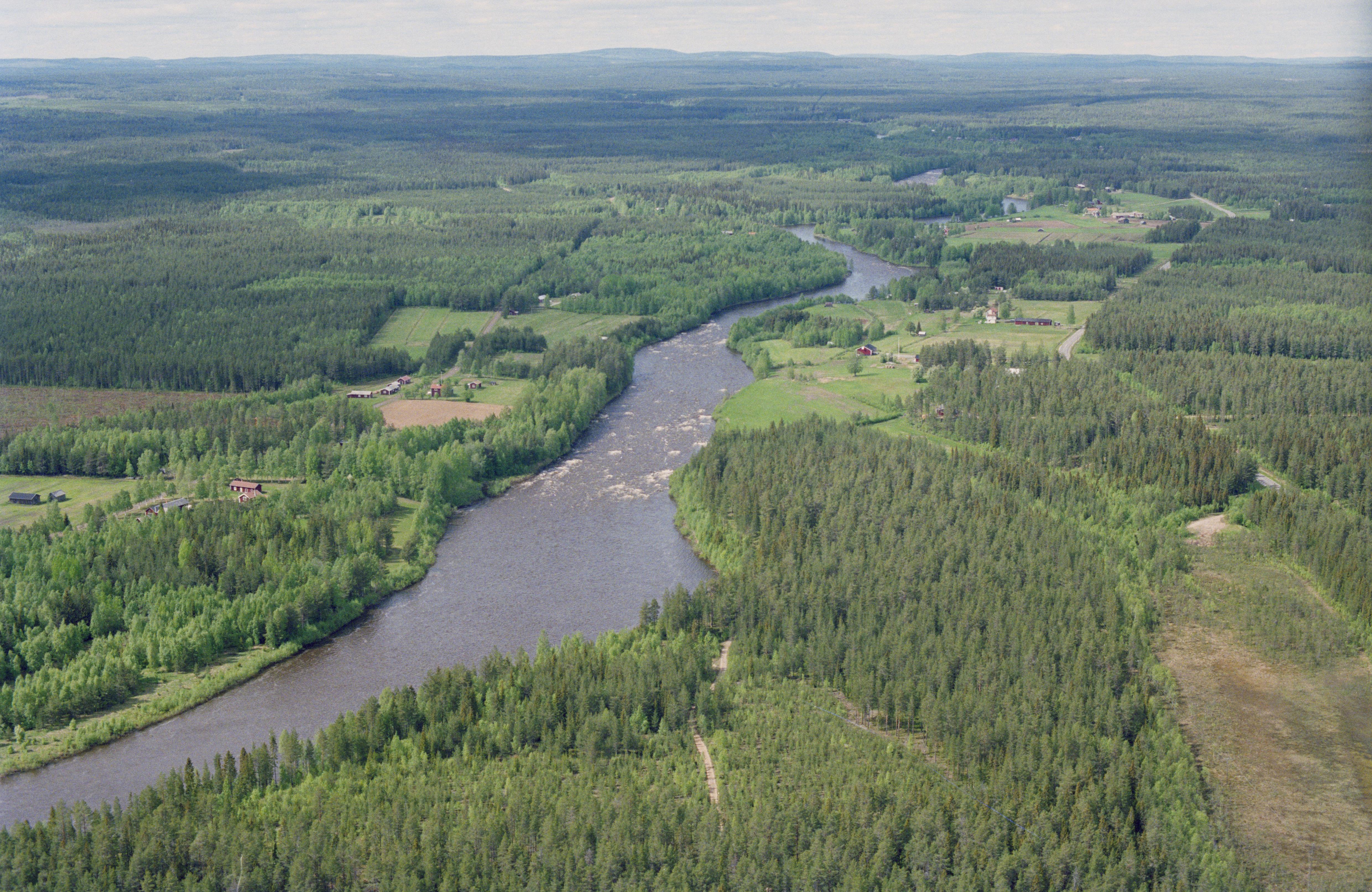 Beskrivning: I bildens mitt Hårdängesforsen i Byskeälven. Till vänster om bildens mitt byn Södra Stensjön. I skogen till vänster i bildens nedre kant en tjärdal/tjärgrop RAÄnr Byske 953. Bilden är tagen mot (väderstreck): VNV
