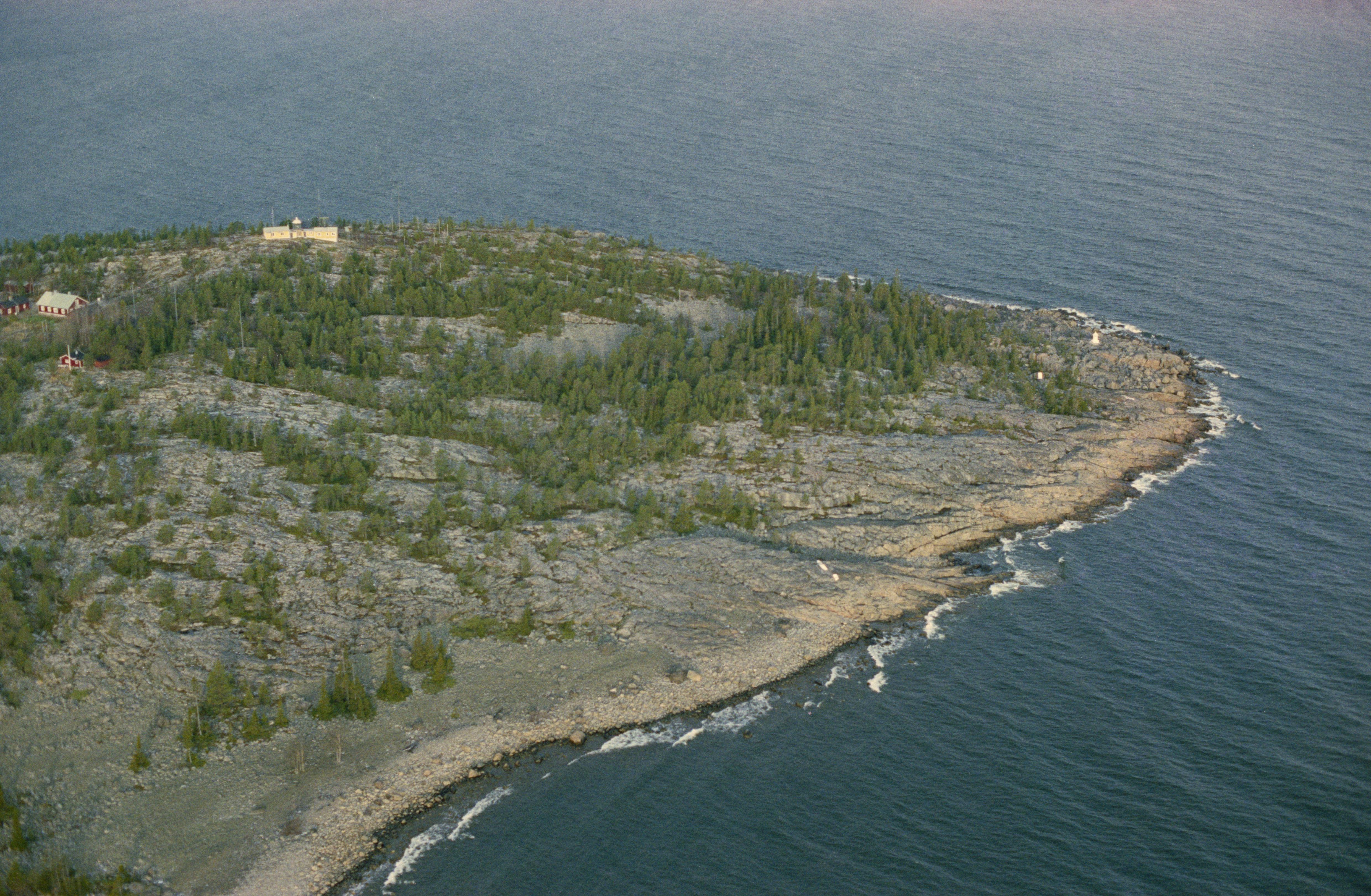 Beskrivning: Udden Bjuröklubb i Bjuröfjärden, norra delen. Uppe till vänster Bjuröklubbs fyrplats och lotsstation. På udden fiskeläge RAÄnr Lövånger 487:1 m.fl, tomtning RAÄnr Lövånger 131:1 m.fl. I vattnet vid udden fartygslämning RAÄnr Lövånger 540 m.fl. Bilden är tagen mot (väderstreck): NV