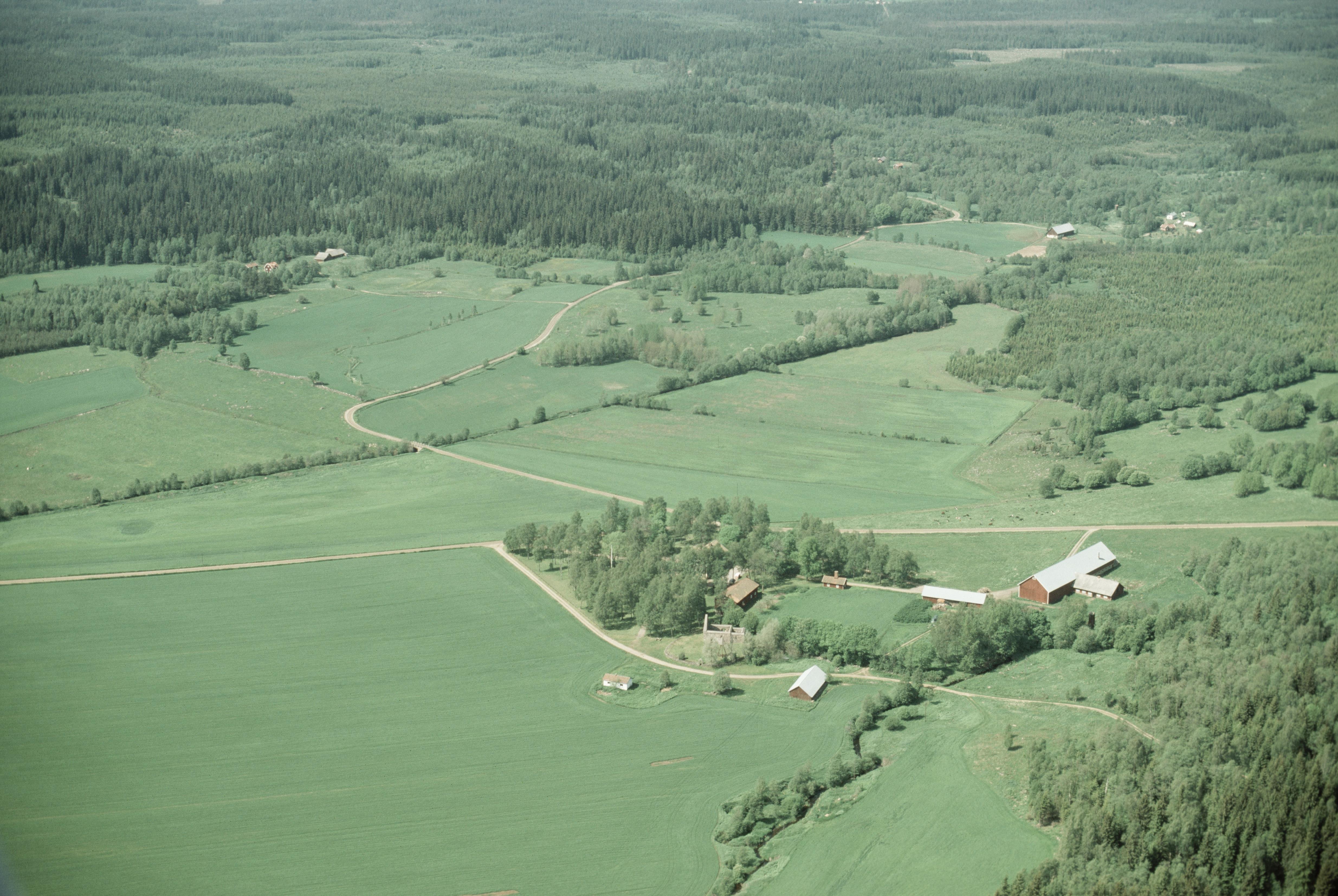 Beskrivning: Fänneslunda kyrkoruin och begravningsplats RAÄnr Fänneslunda 5:1-2 vid bildens mitt. Bilden är tagen mot (väderstreck): NV