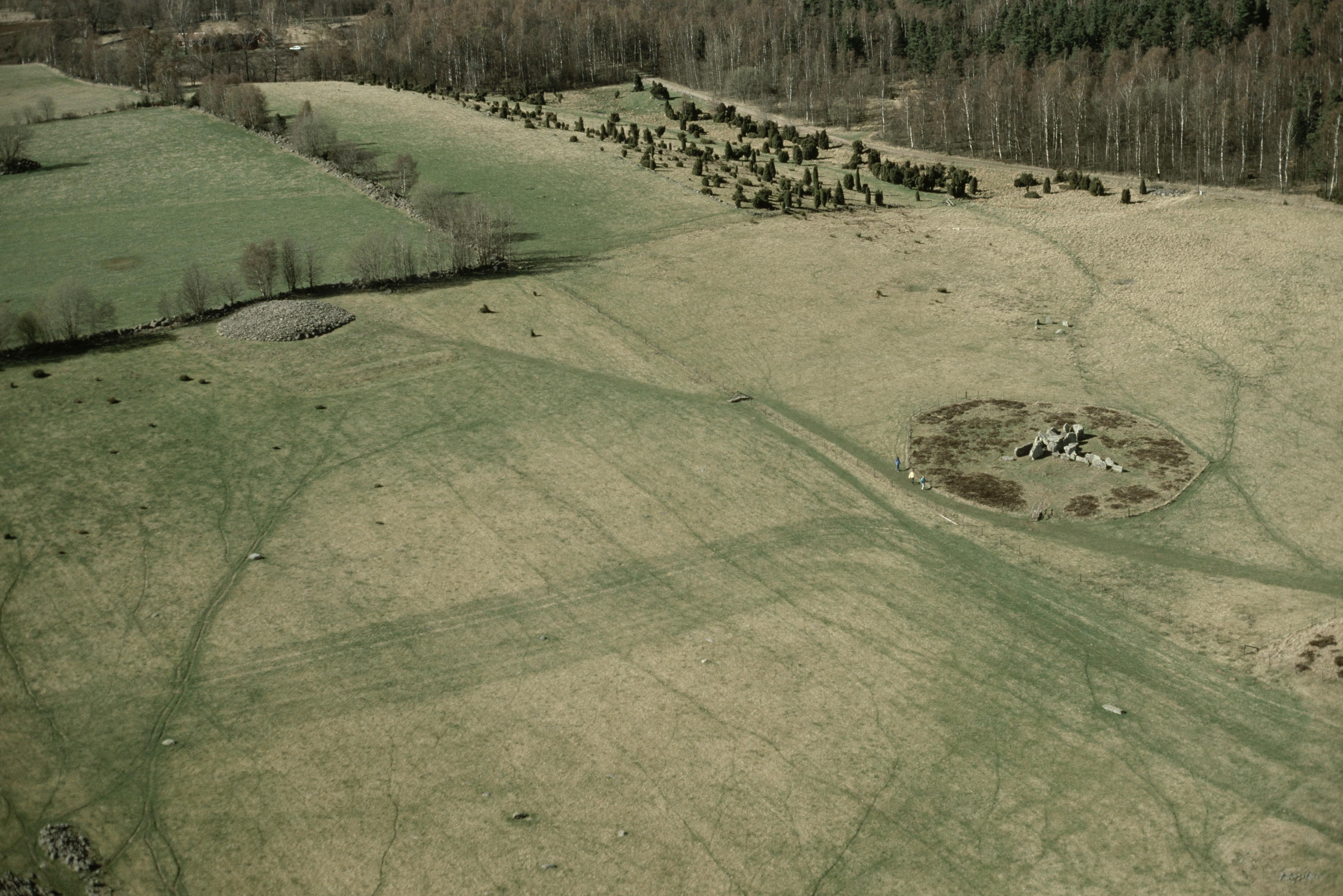 Beskrivning: Uppe till vänster röse/grav RAÄnr Hornborga 32:1-2 och till höger om bildens mitt Hornborga 31:1-5 (stenkammargrav Gigerugnen / Girommen med hällristningar och stenkrets). Bilden är tagen mot (väderstreck): NV