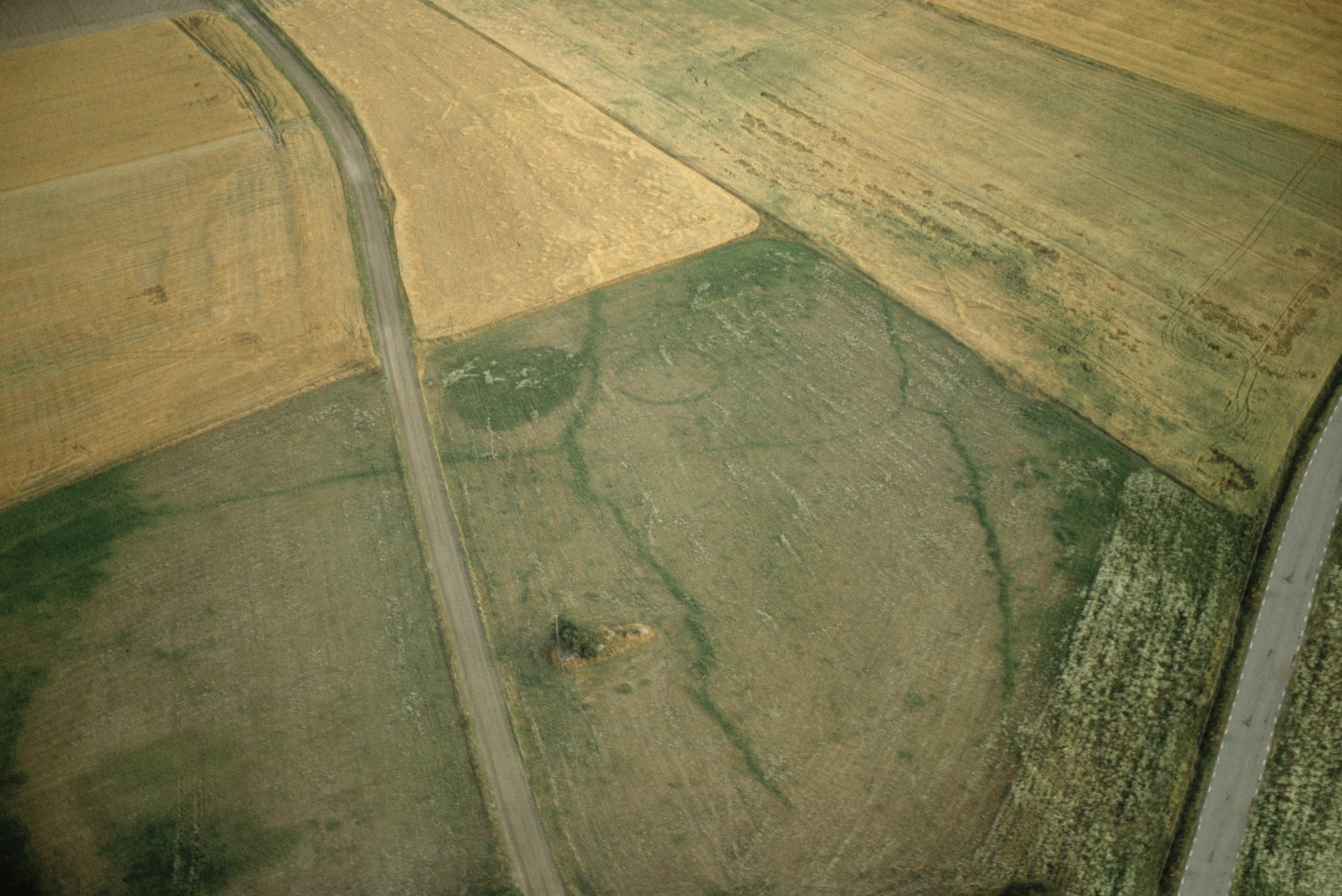 Beskrivning: Cropmarks i åker. Domarring RAÄnr Larv 32:1 och hög och stensättning Larv 39:1-2, m.fl. Bilden är tagen mot (väderstreck): SSV