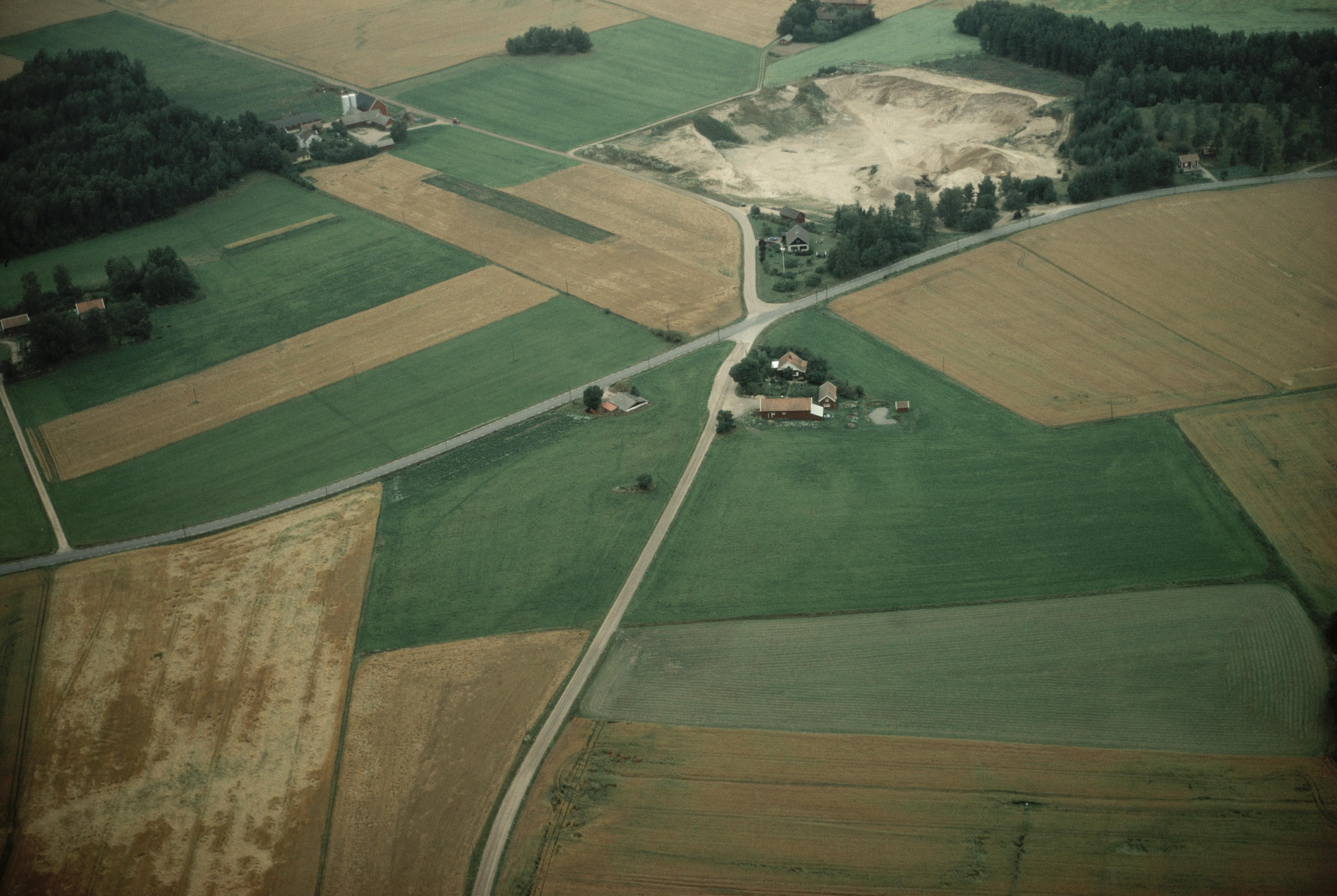 Beskrivning: Cropmarks i åker. Domarring RAÄnr Larv 32:1 och hög och stensättning Larv 39:1-2, m.fl. Bilden är tagen mot (väderstreck): NNV