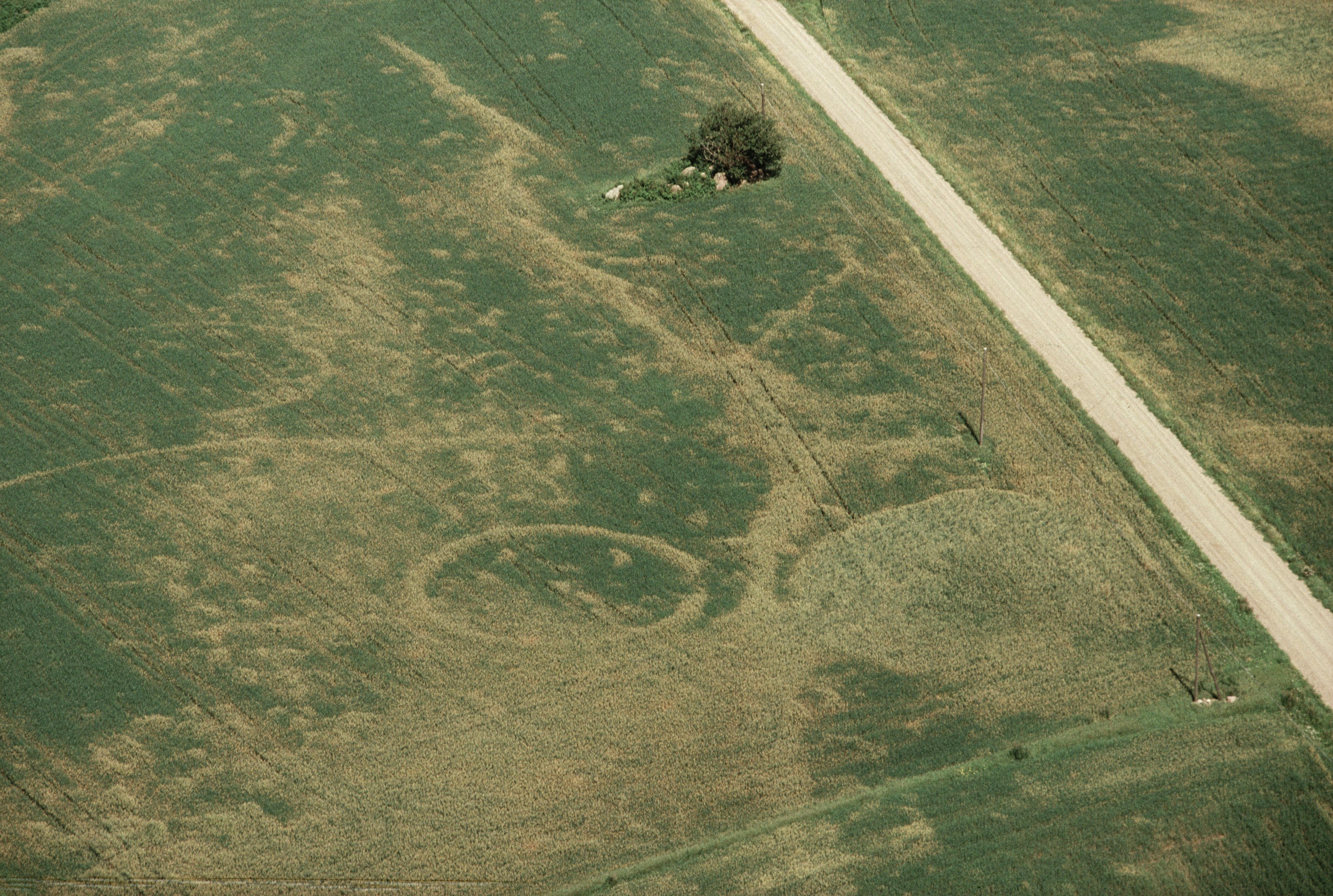 Beskrivning: Cropmarks i åker. Domarring RAÄnr Larv 32:1 och hög och stensättning Larv 39:1-2, m.fl. Bilden är tagen mot (väderstreck): NNO