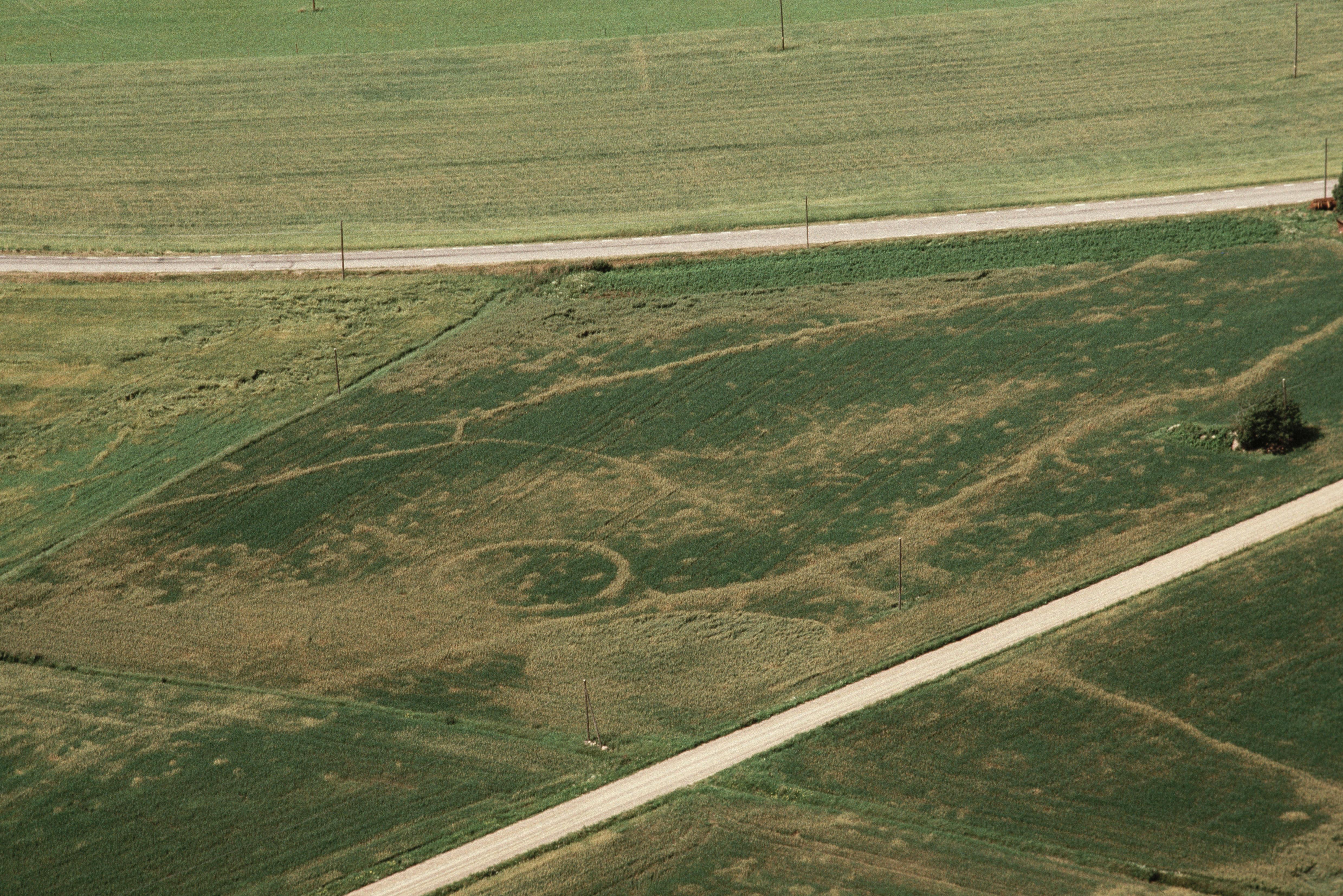 Beskrivning: Cropmarks i åker. Domarring RAÄnr Larv 32:1 och hög och stensättning Larv 39:1-2, m.fl. Bilden är tagen mot (väderstreck): V