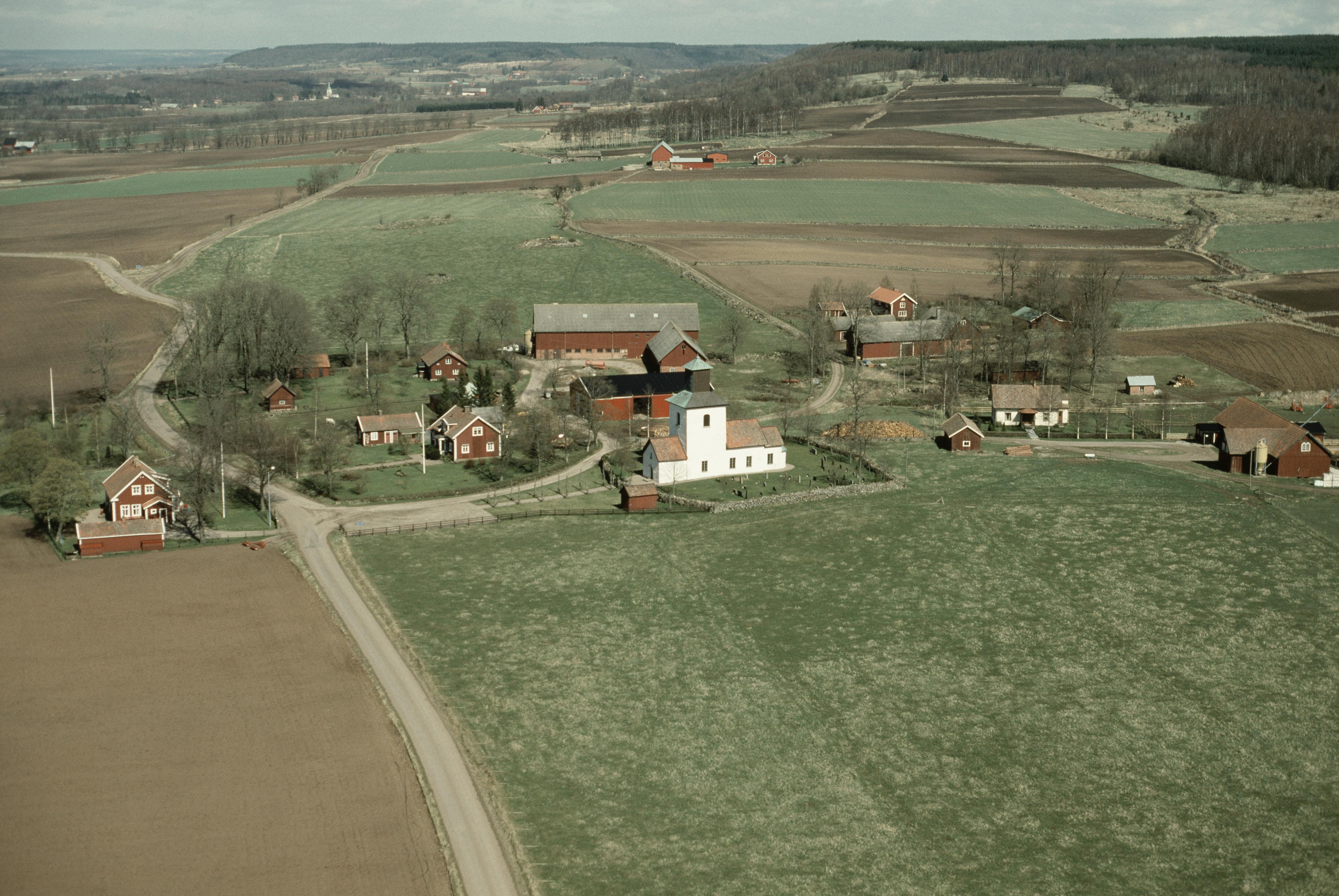Beskrivning: Mularps kyrka och kyrkby. Bilden är tagen mot (väderstreck): NNO