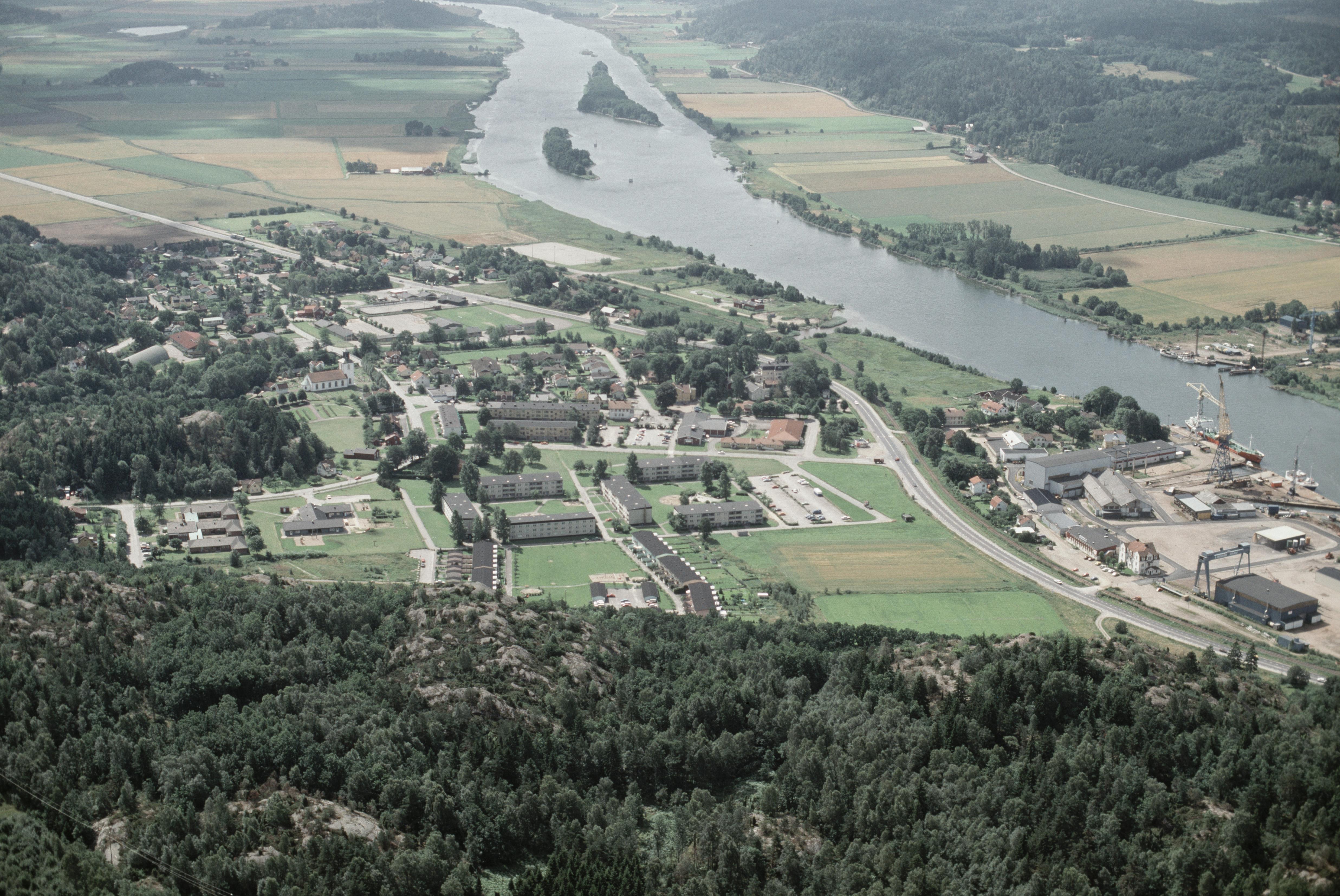 Beskrivning: Lödöse tätort vid Göta älv. Sankt Peders kyrka till vänster om bildens mitt. Bilden är tagen mot (väderstreck): SV