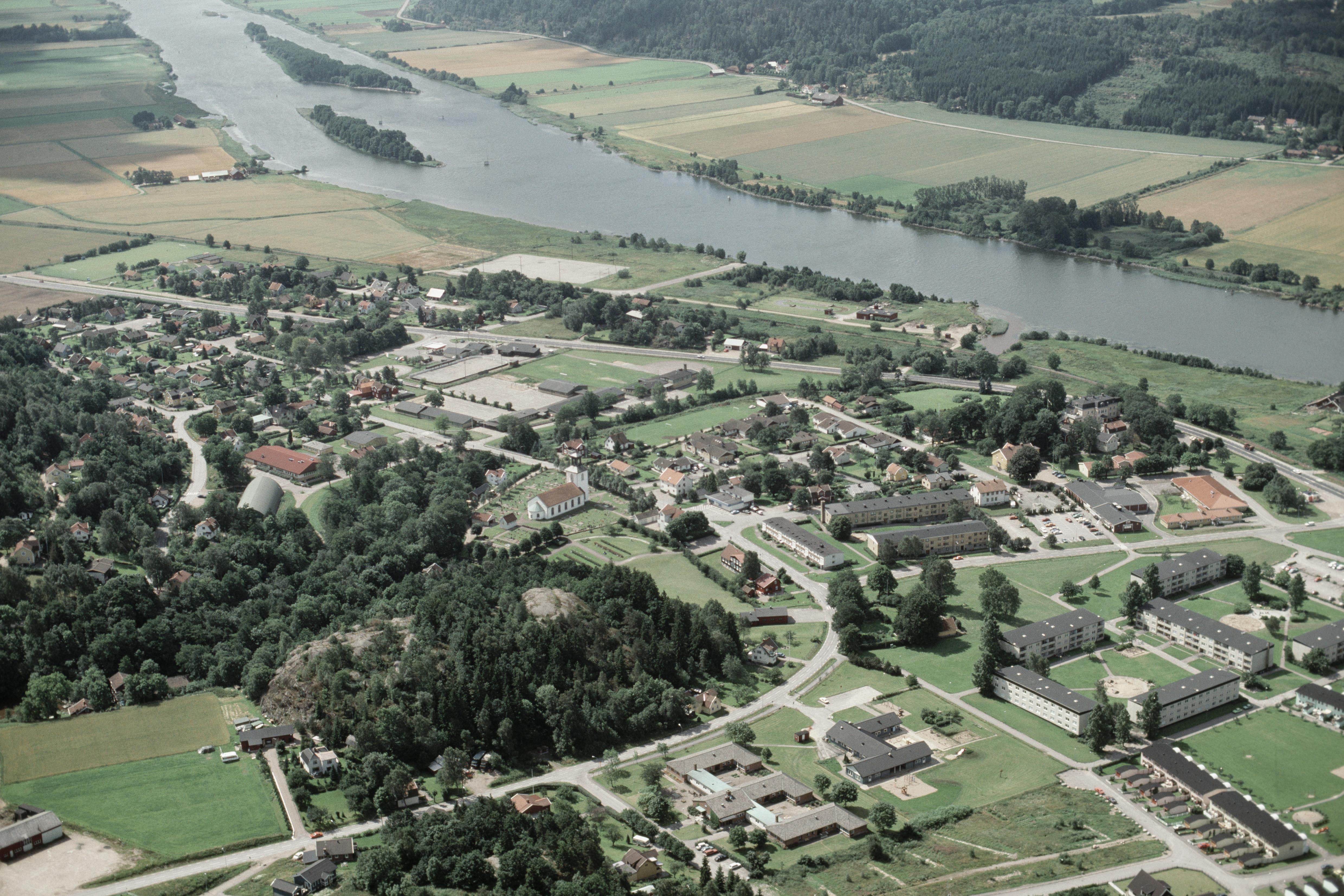 Beskrivning: Lödöse tätort vid Göta älv. Sankt Peders kyrka till vänster vid bildens mitt. Bilden är tagen mot (väderstreck): SV