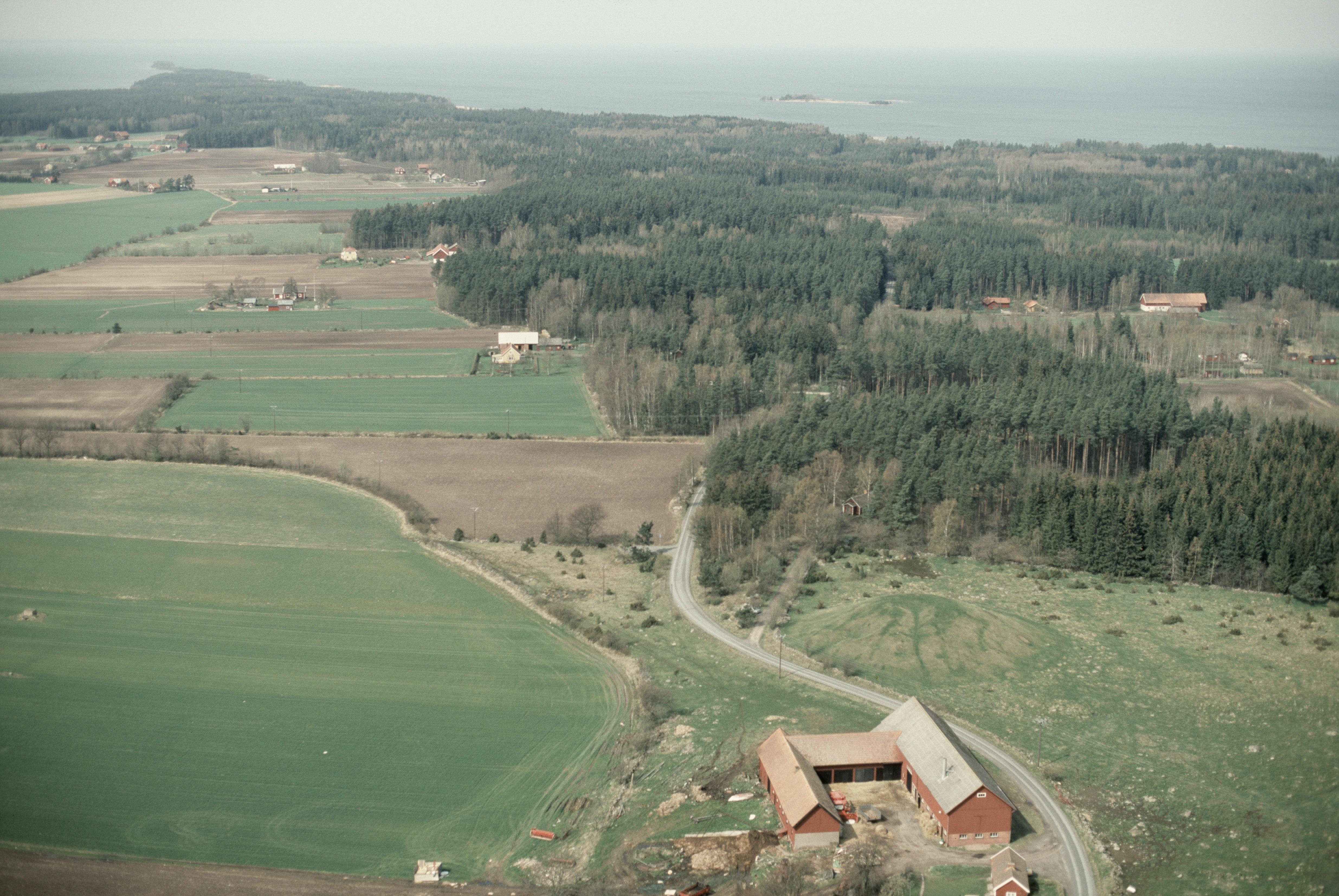 Beskrivning: Skalunda hög RAÄnr Skalunda 3:1 vid bildens mitt. I bildens övre del till vänster Hindens rev i Söne socken. Bilden är tagen mot (väderstreck): NV