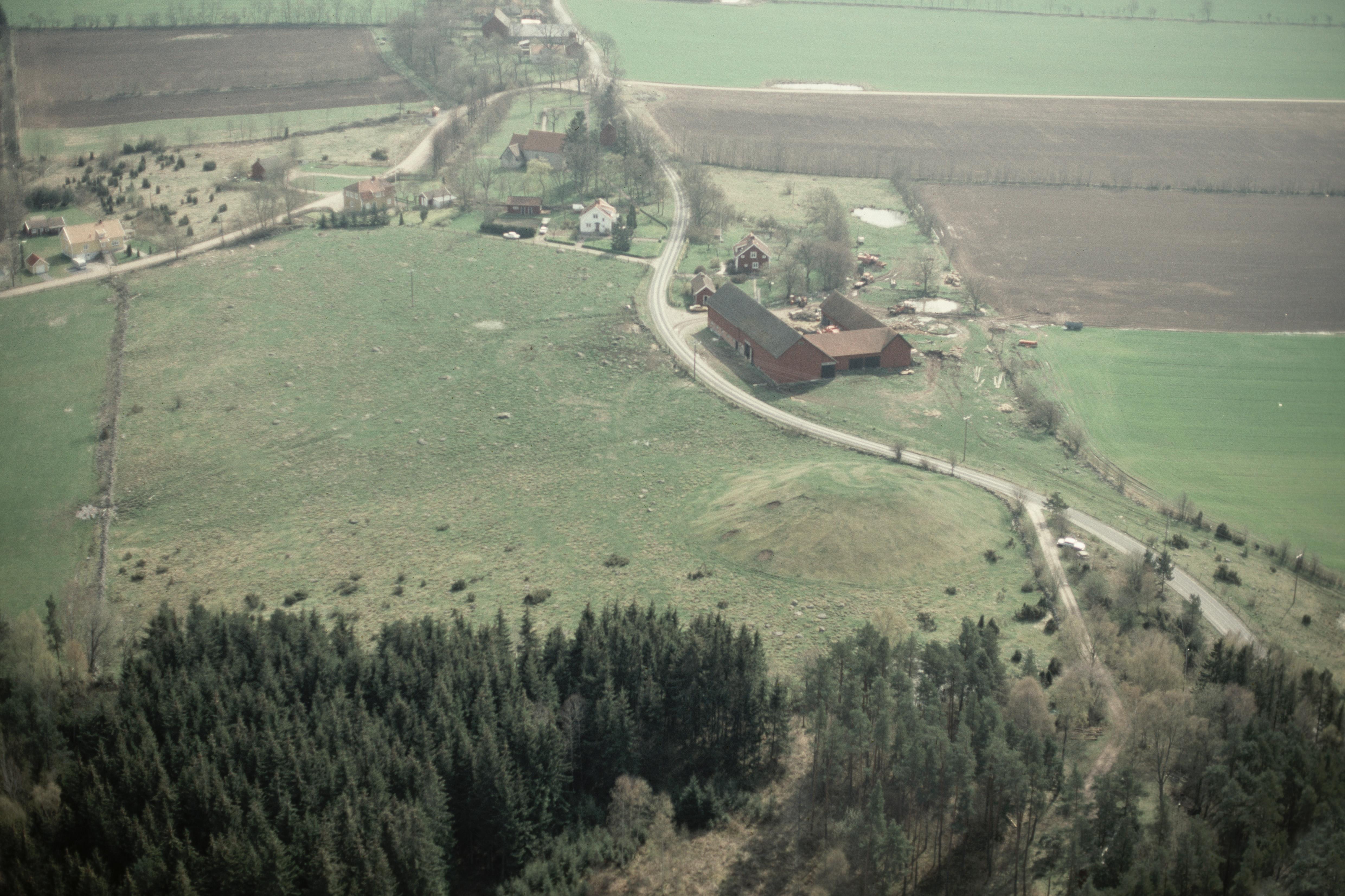 Beskrivning: Skalunda kyrka och Skalunda hög RAÄnr Skalunda 3:1 (i bildens nedre del). Bilden är tagen mot (väderstreck): SO