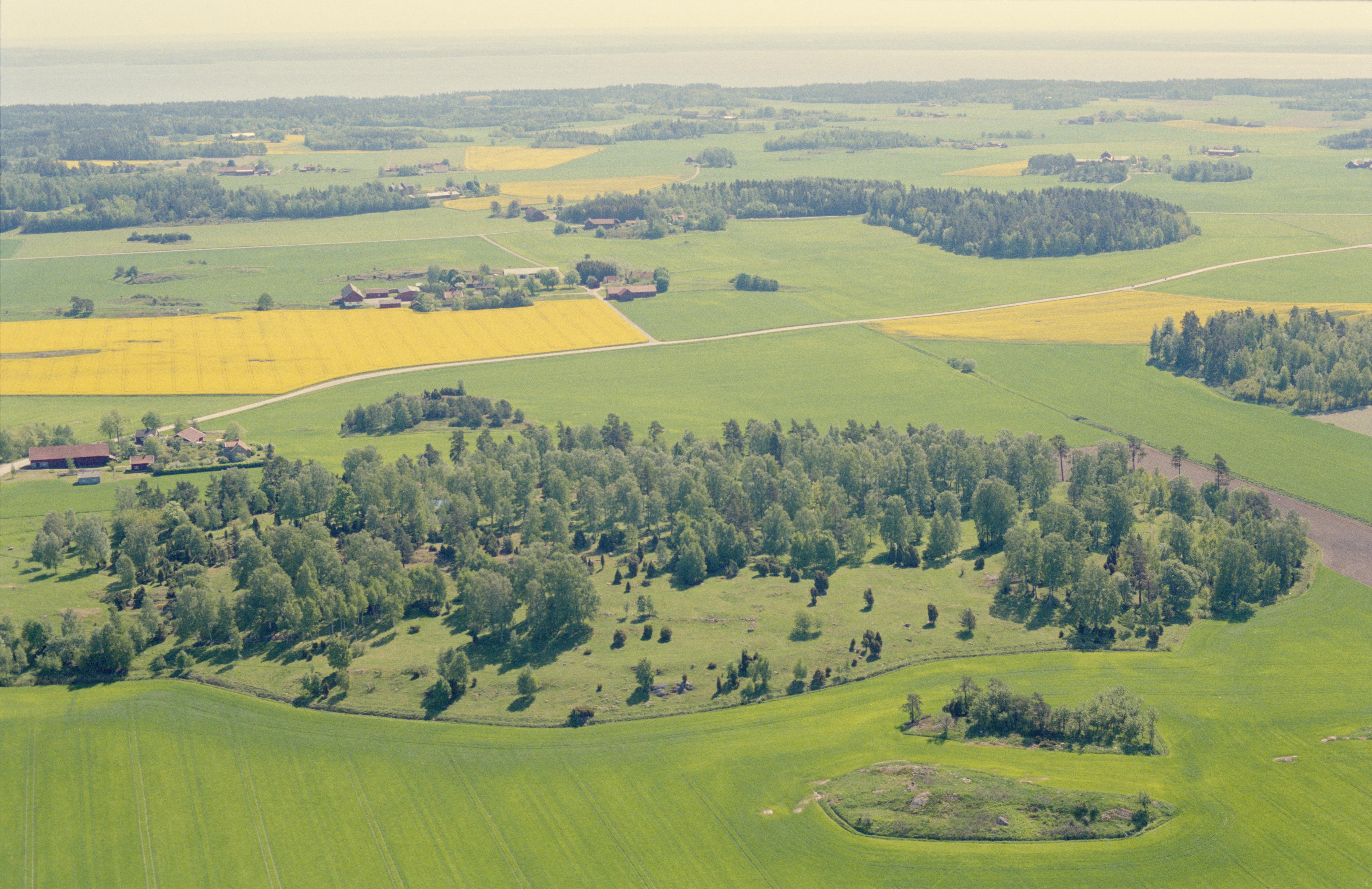Beskrivning: Gravfält Stenhusbacken RAÄnr Sunnersberg 4:1, Sunnersberg 11:1 och fossil åkermark Sunnersberg 4:2-6 m.fl. Fröslunda i bildens övre del. Bilden är tagen mot (väderstreck): V