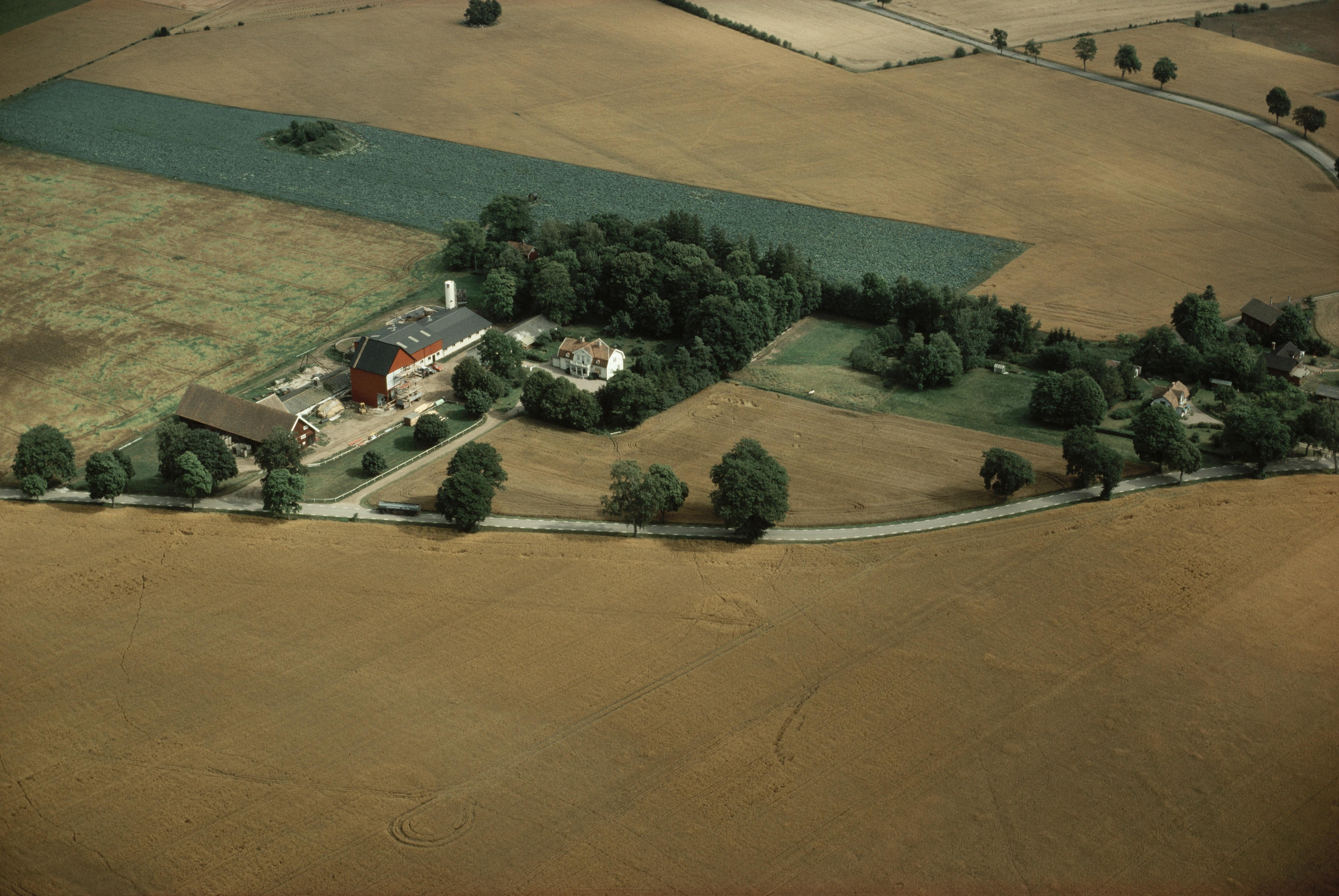 Beskrivning: Cropmarks i åker under bildens mitt vid stensättning Grannehög RAÄnr Sävare 4:1. Till vänster vid vägkorsningen cropmark, fyndplats och stensättning RAÄnr Sävare 35:1. Bilden är tagen mot (väderstreck): SO