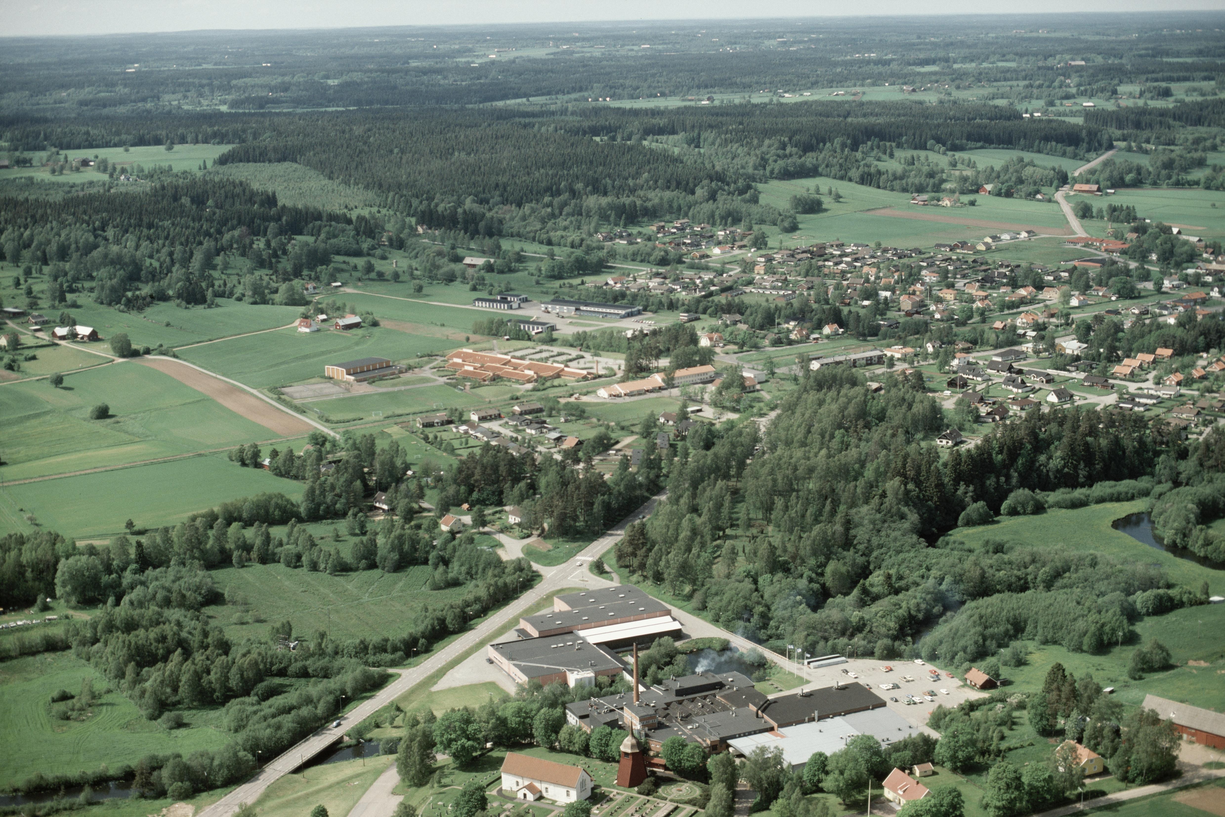 Beskrivning: Timmele kyrka (i bildens nedre del) och tätort. Gravfält RAÄnr Timmele 45:1 och färdväg Timmele 45:2 vid bildens mitt. Bilden är tagen mot (väderstreck): NV