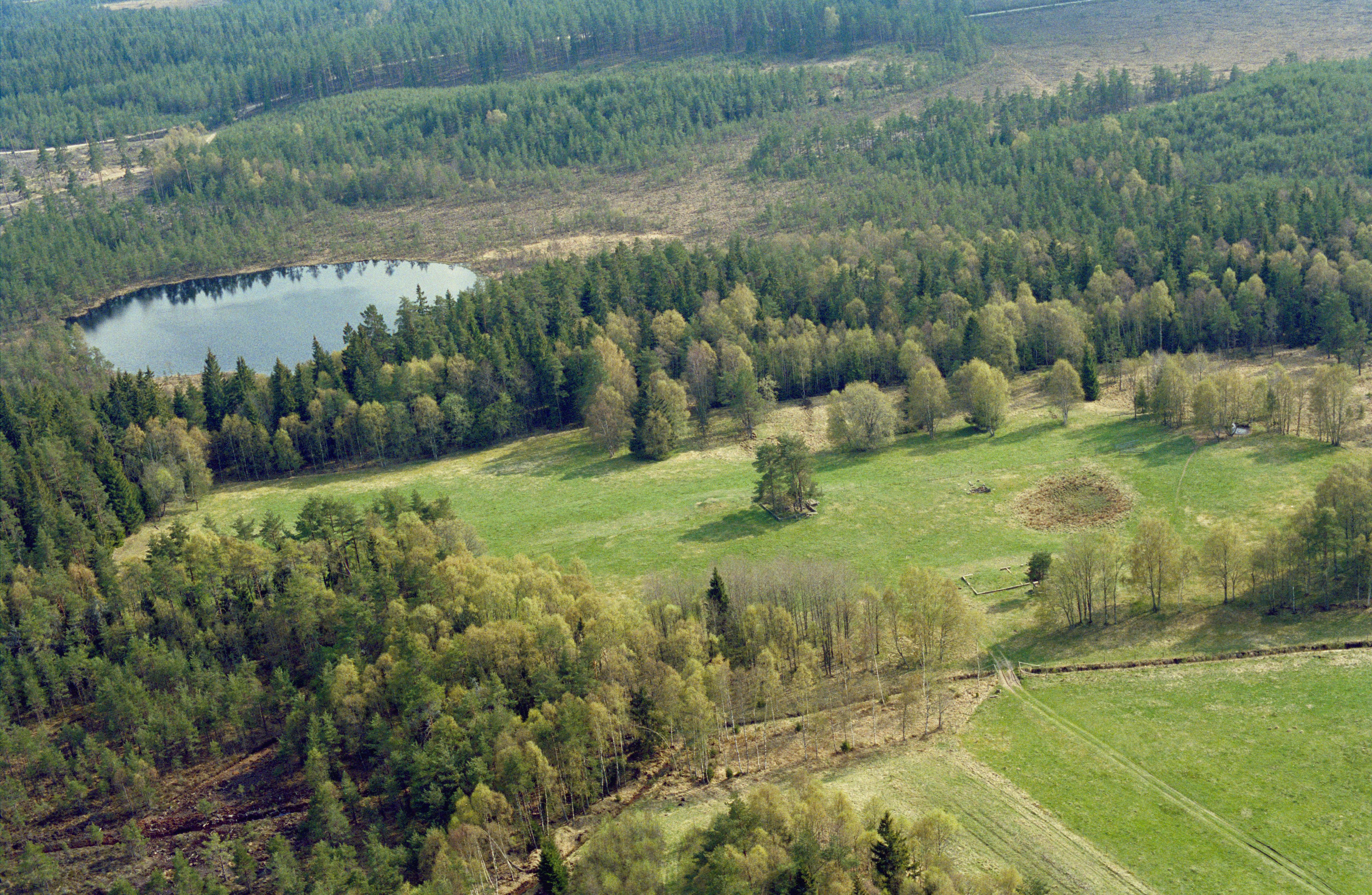 Beskrivning: Rödjordsområde vid Sjöryd och Store Mossen. Gransjön och Björkesjö. Lägenhetsbebyggelse RAÄnr Tranemo 282:1. I bildens övre del kolningsanläggning RAÄnr Tranemo 303:1. Bilden är tagen mot (väderstreck): SO