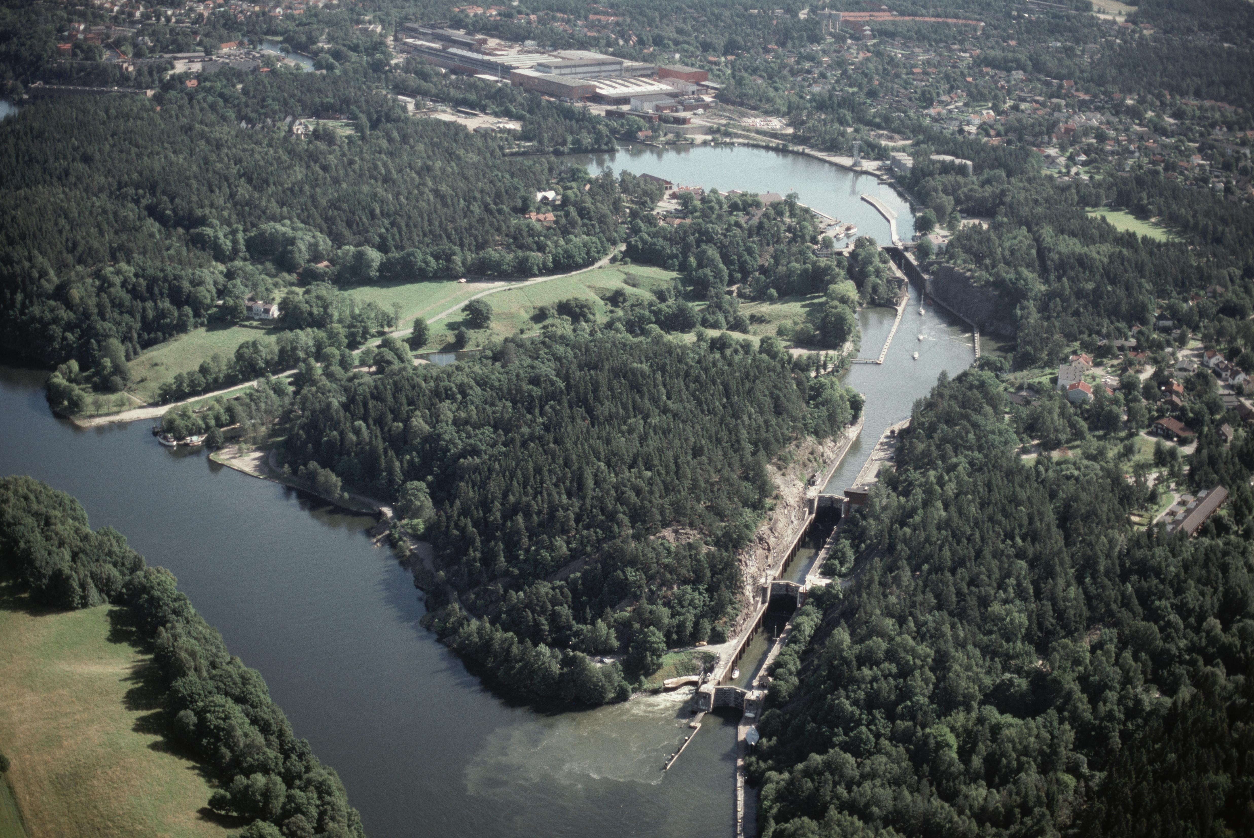 Beskrivning: Göta älv i Trollhättans stad. Slussar i kanalanläggning RAÄnr Trollhättan 128:1-2 m.fl. i Åkers sjö. Bilden är tagen mot (väderstreck): NO
