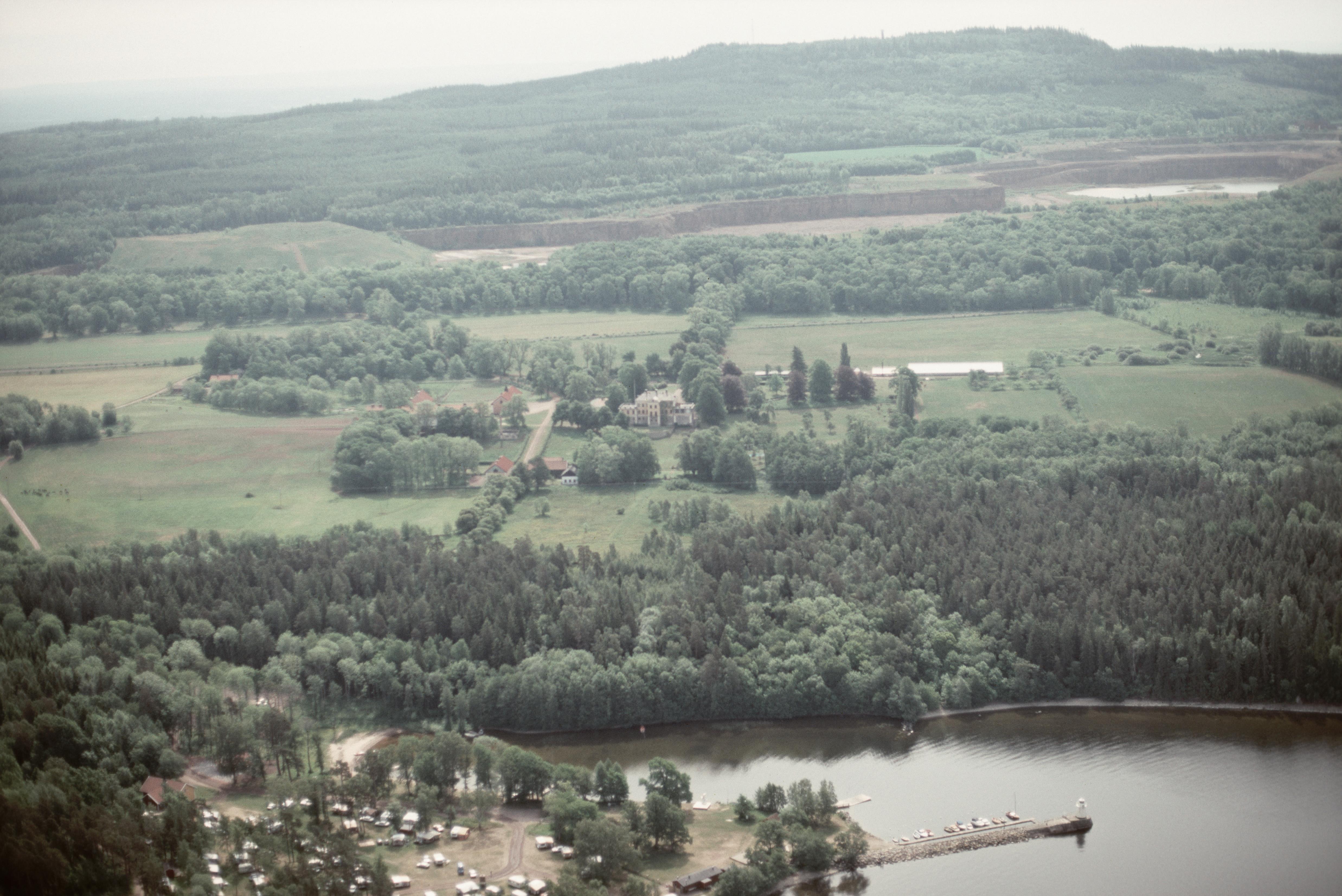 Beskrivning: Hellekis herrgård / säteri (skrivs även Hällekis). I bildens övre del Kinnekulle utsiktstorn på Högkullen vid Österplana socken. Bilden är tagen mot (väderstreck): SO