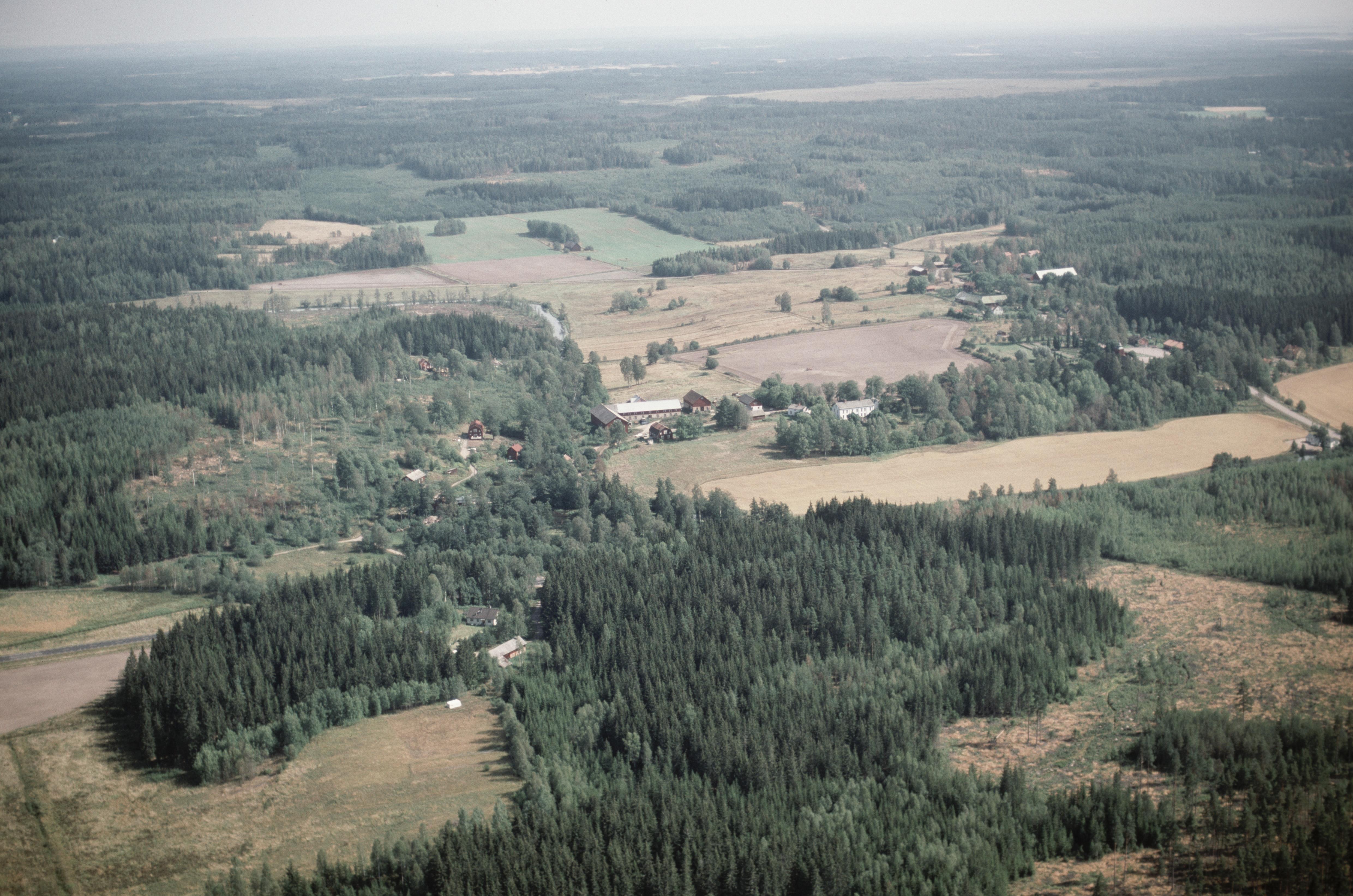 Beskrivning: Alsterälven i Alsterdalen. Alstrums herrgård RAÄnr Alster 72:1 och Alsters kyrka vid bildens mitt. Bilden är tagen mot (väderstreck): SO