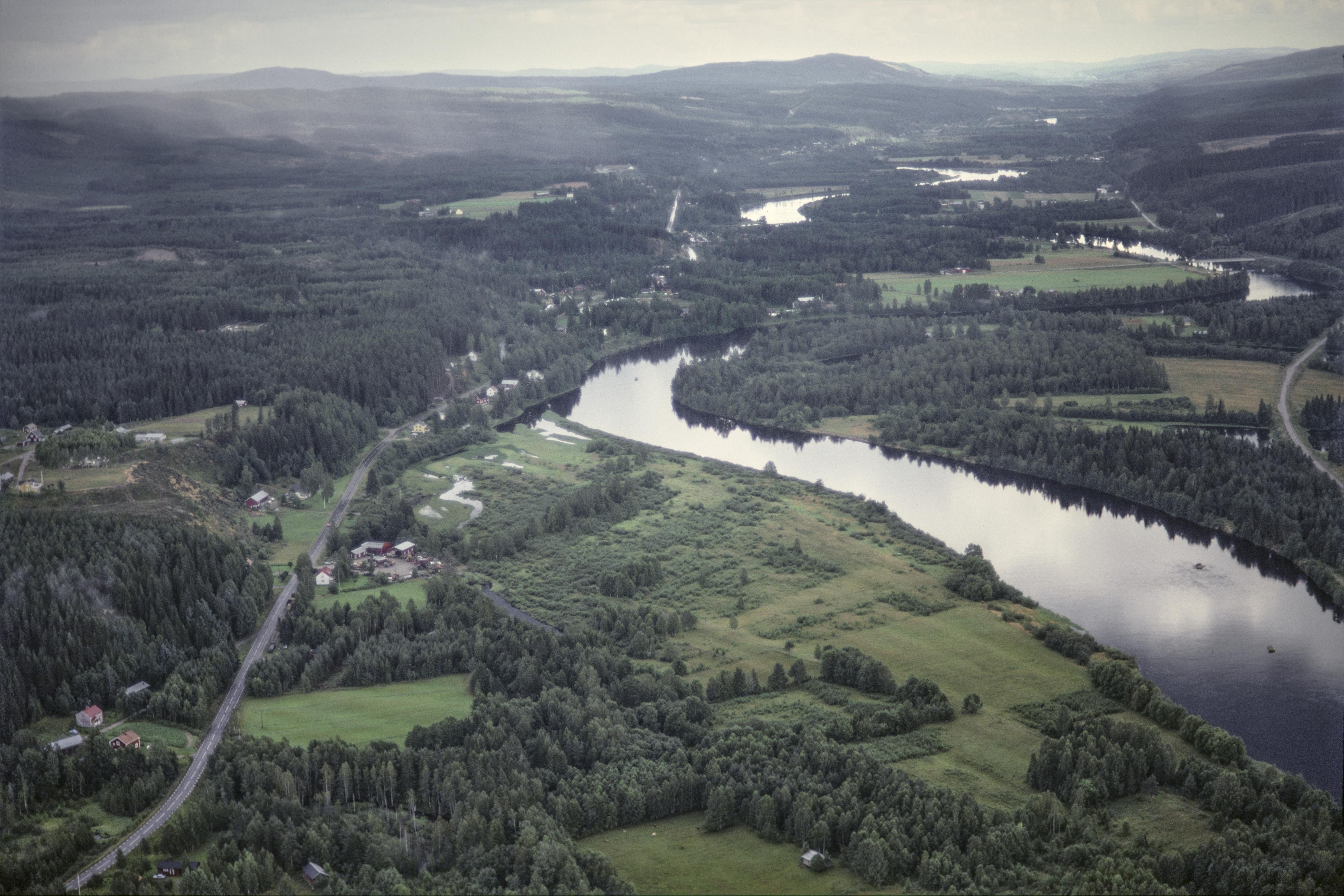 Beskrivning: Likenäs by vid Klarälven. Till höger Knappnäs naturrreservat. Vid bildens mitt fångstgrop RAÄnr Dalby 85:1 m.fl. Bilden är tagen mot (väderstreck): SO