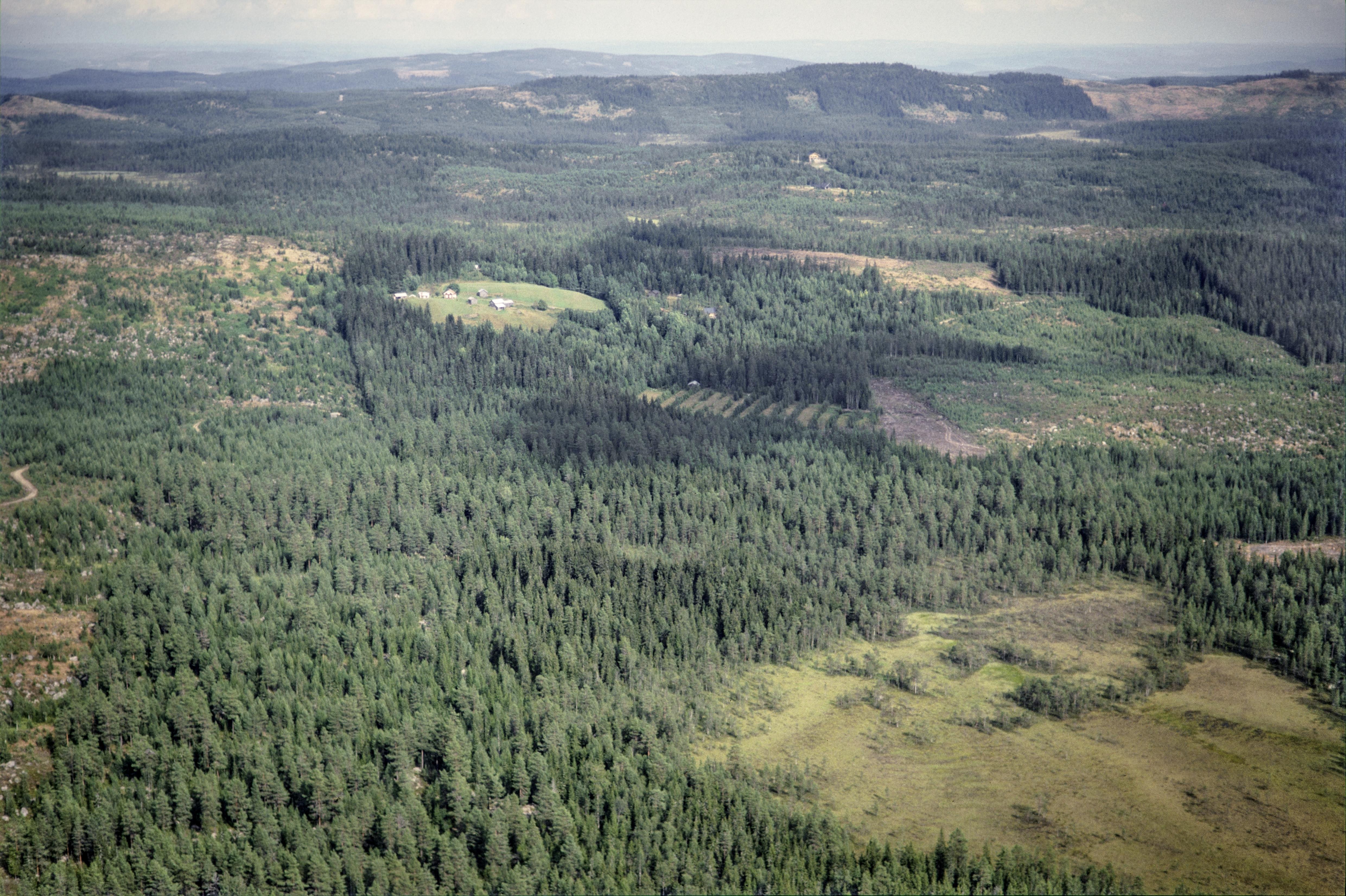 Beskrivning: Vid bildens mitt Kronhallen finngård. Vid gården tjärbränningsugn RAÄnr Lekvattnet 139:1. Bilden är tagen mot (väderstreck): Ö