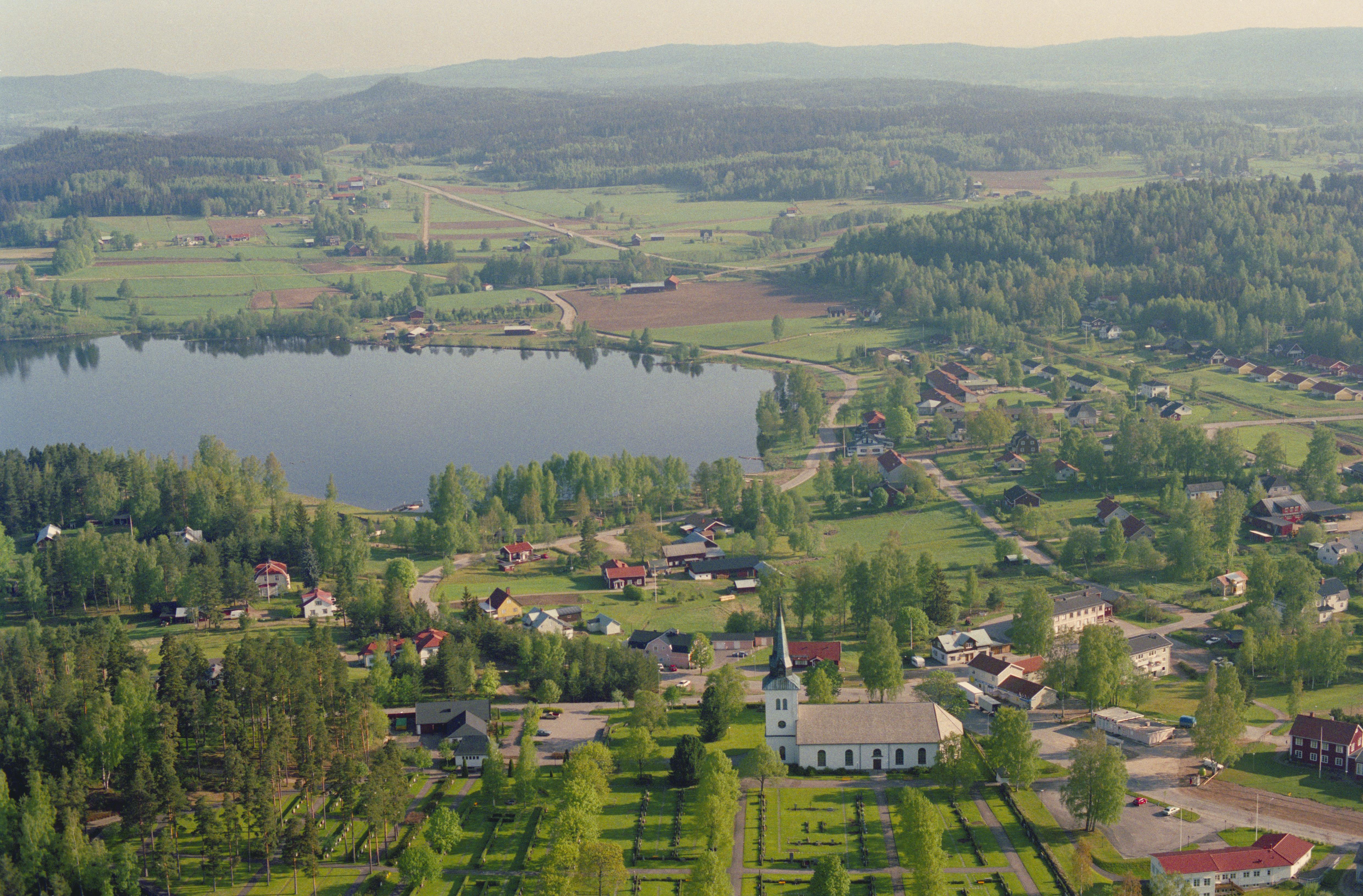 Beskrivning: Lysvik kyrka och kyrkby vid sjön Övre Fryken. Bilden är tagen mot (väderstreck): N