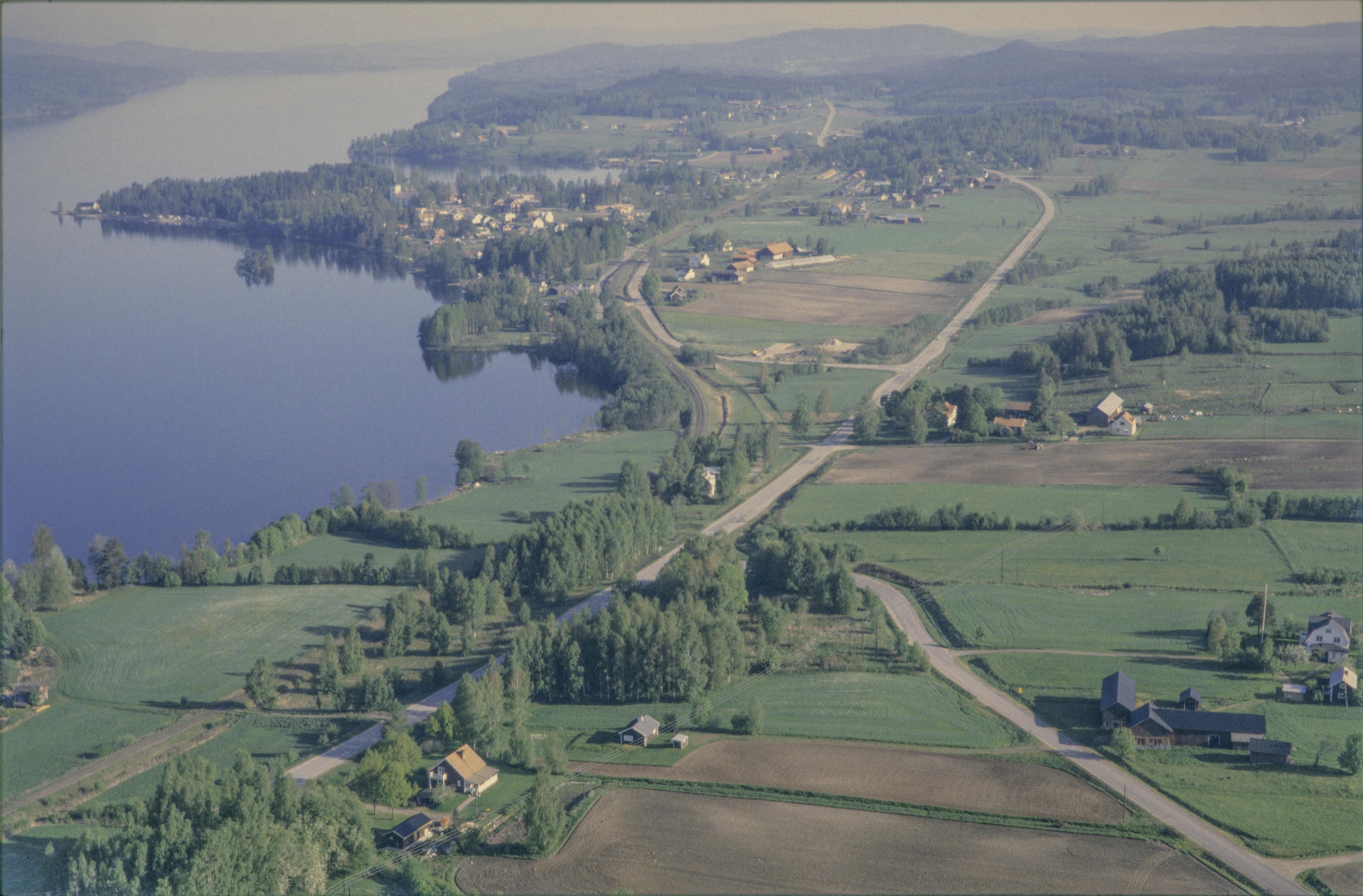 Beskrivning: Smideslämning RAÄnr Lysvik 34:1 vid Skäggegård till höger om bildens mitt. Uppe till vänster Lysvik kyrka och kyrkby vid sjön Övre Fryken. Bilden är tagen mot (väderstreck): NNV