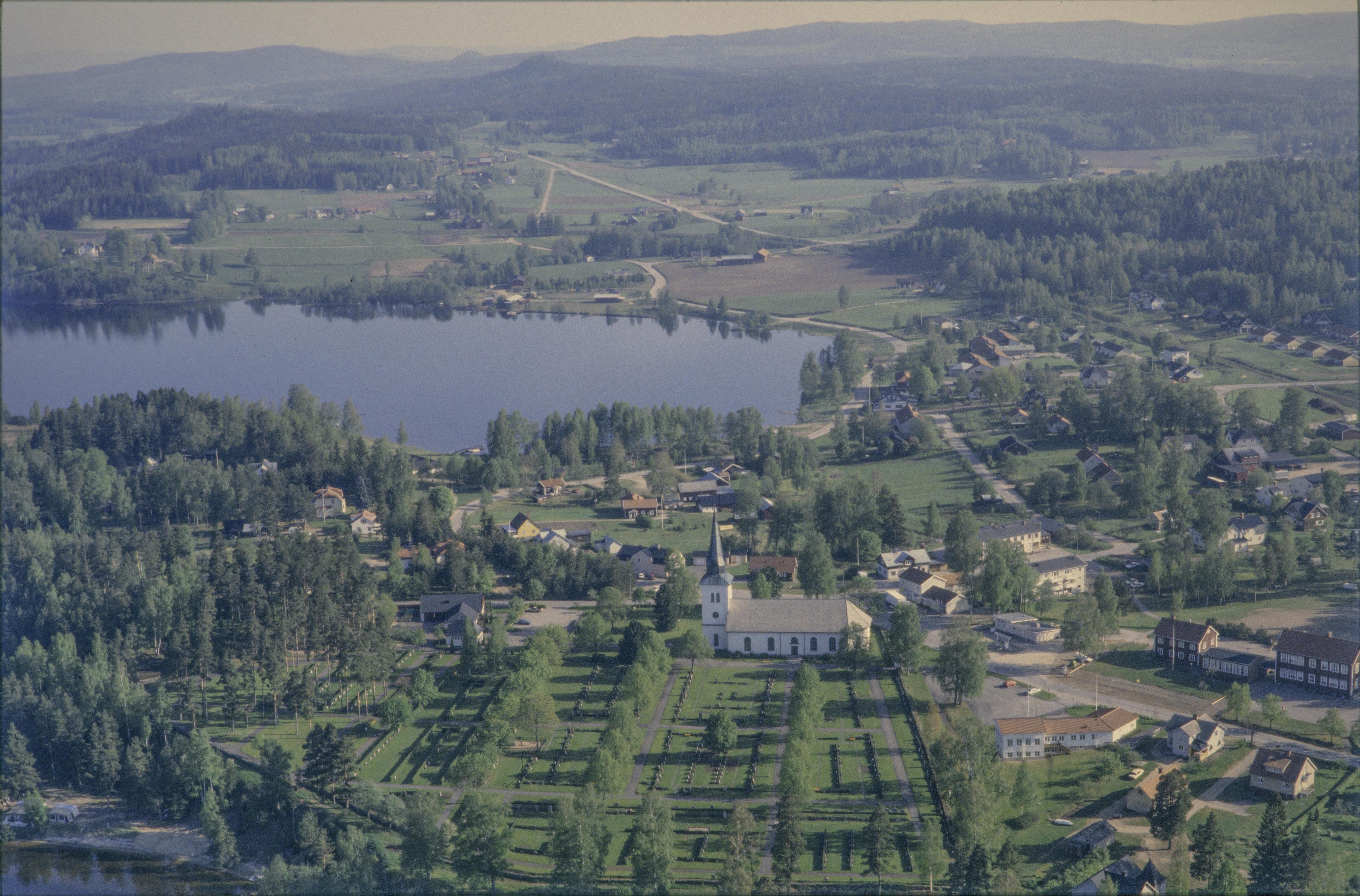 Beskrivning: Lysviks kyrka och kyrkby vid sjön Övre Fryken. Bilden är tagen mot (väderstreck): NNO