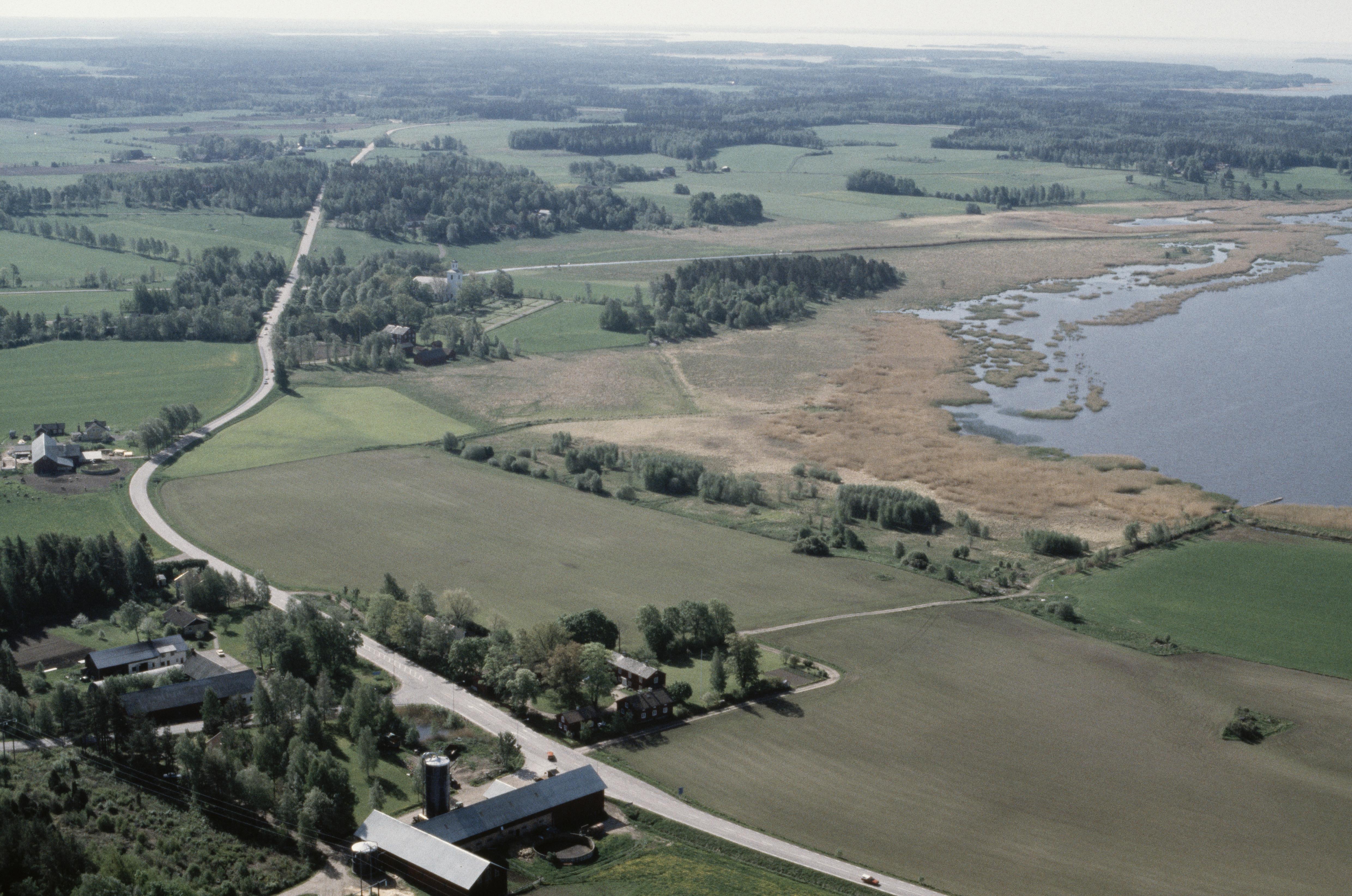 Beskrivning: Östra Ve med kronofogdebostället RAÄnr Väse 64:1. I bildens övre del Väse kyrka. Ån Glummans utlopp i sjön Panken. Bilden är tagen mot (väderstreck): OSO