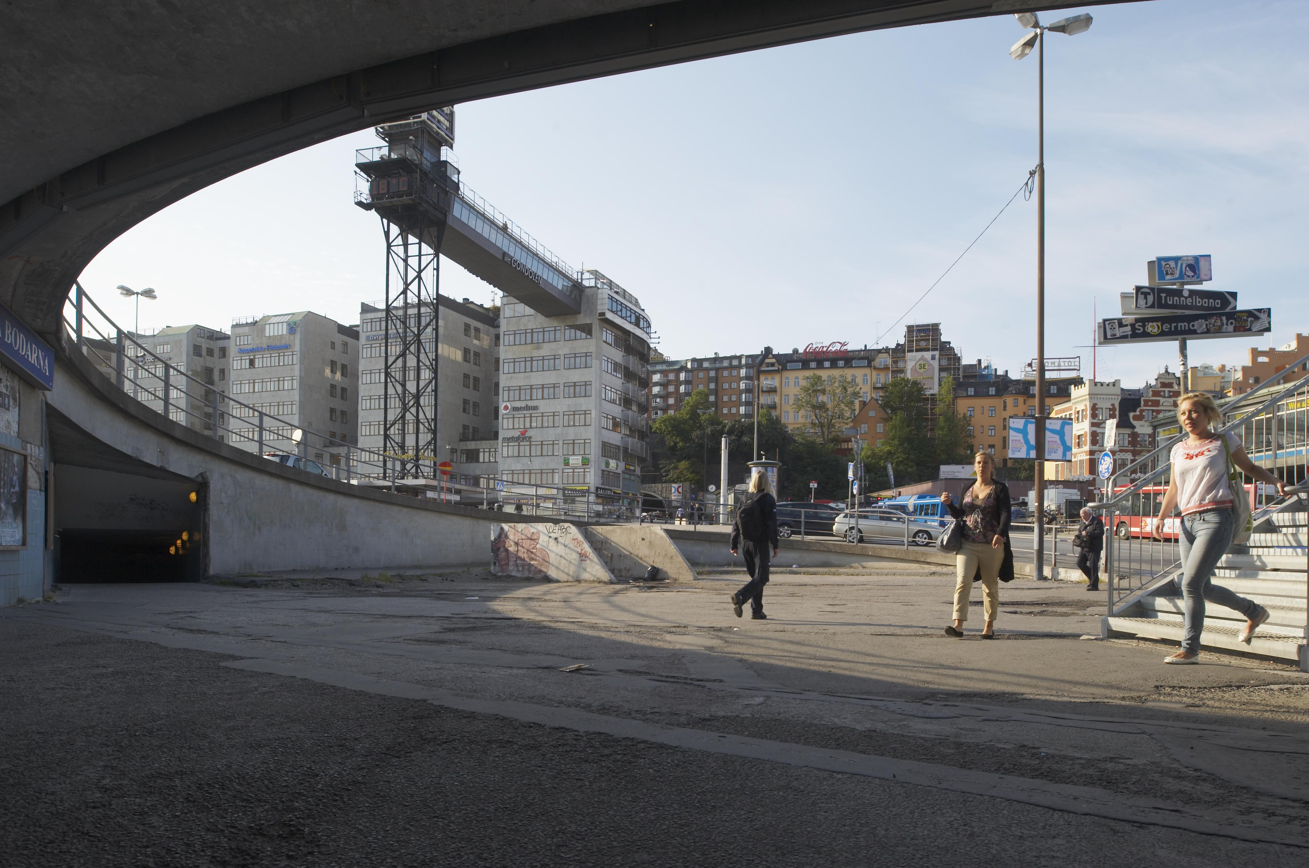 År 1930 tillsattes en kommitté för utredande av stadens kollektivtrafikfrågor, vilkens arbete resulterade i den anläggning som nu finns. Stadsplanekontorets ingenjör Gösta Lundborg och arkitekt Tage William-Olsson utarbetade förslaget till trafikanordningar med korsningar i tre plan i en "klöverbladsform". Trafiken fördelades i olika höjdnivåer, en för kajplanet, en för Munkbron - Katarinavägen och en för Skeppsbron - Södermalmstorg. Förslaget började genomföras 1931. Redan efter fyra år kunde trafikanläggningen invigas, den 15 oktober 1935. Samtidigt hade KF:s stora kontorshus och den nya Katarinahissen färdigställts.