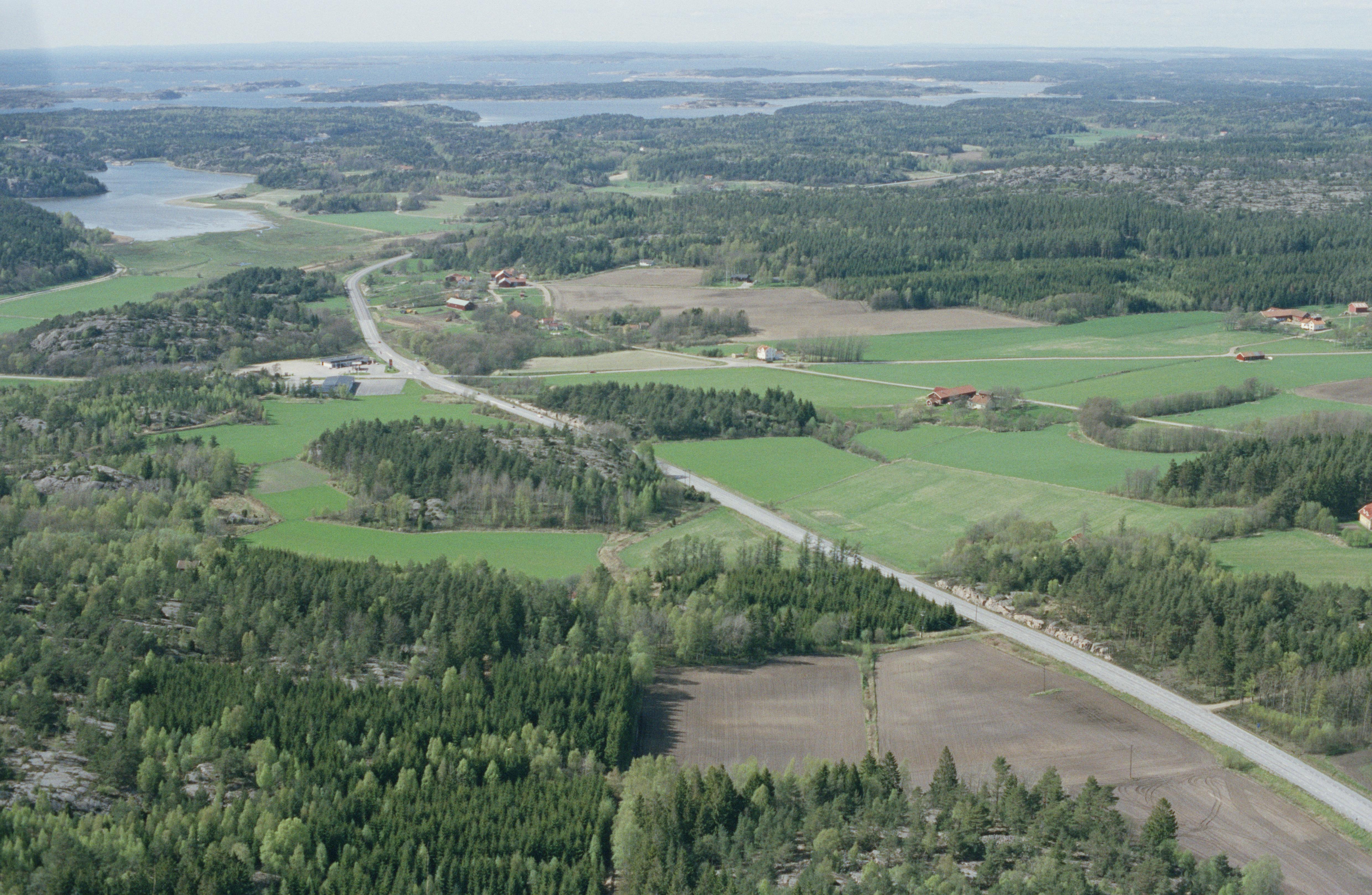 Beskrivning: Uppe till vänster arkeologisk undersökning vid Larsgården. Över bildens mitt område med hällristning RAÄnr Tanum 2353:1 och boplats Tanum 1220:1 m.fl. I bildens övre del Tannamskilen. Bilden är tagen mot (väderstreck): NV