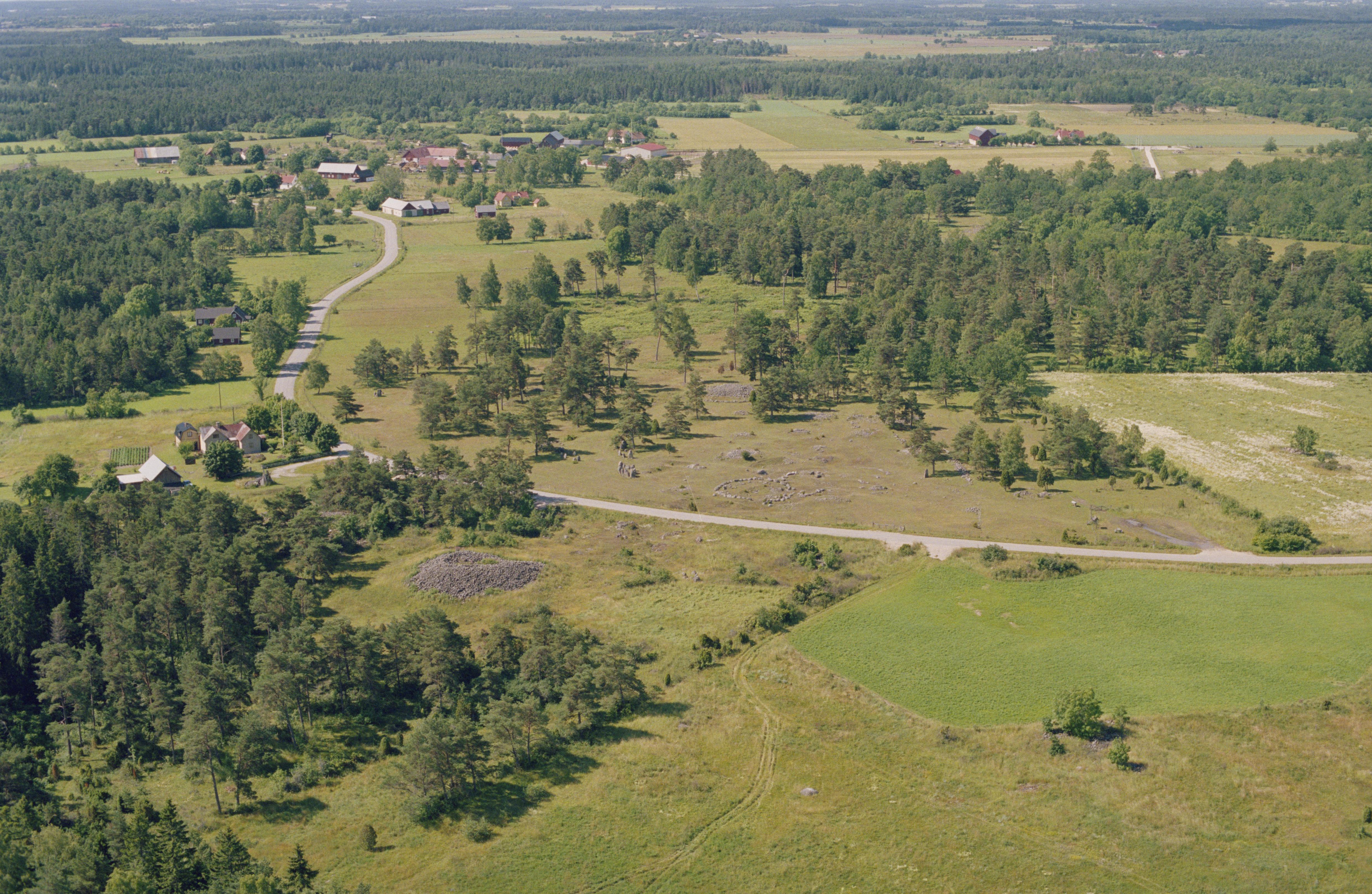 Beskrivning: På båda sidor av vägen Gålrums gravfält Alskog 9:1 med flera rösen och skeppssättningar m.m. Röset Digerrojr till vänster under bildens mitt. Byarna Guffride och Hallgårds uppe till vänster. Bilden är tagen mot (väderstreck): SV