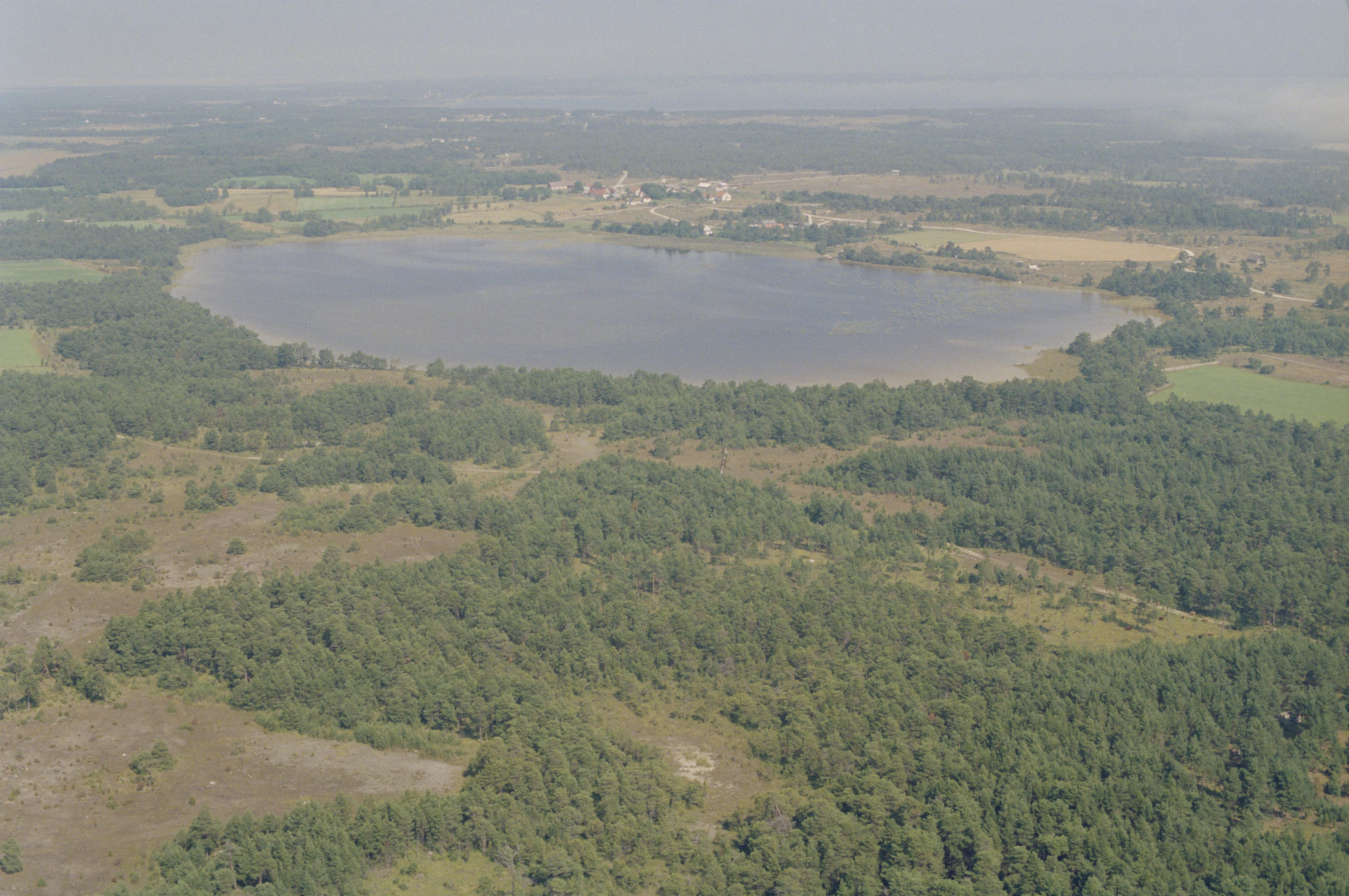 Beskrivning: Sjön Dämbaträsk. I skogen under bildens mitt (vid sjön södra ände) hägnad RAÄnr Fårö 254:1. I bildens övre del Dämba by, Bilden är tagen mot (väderstreck): NNO