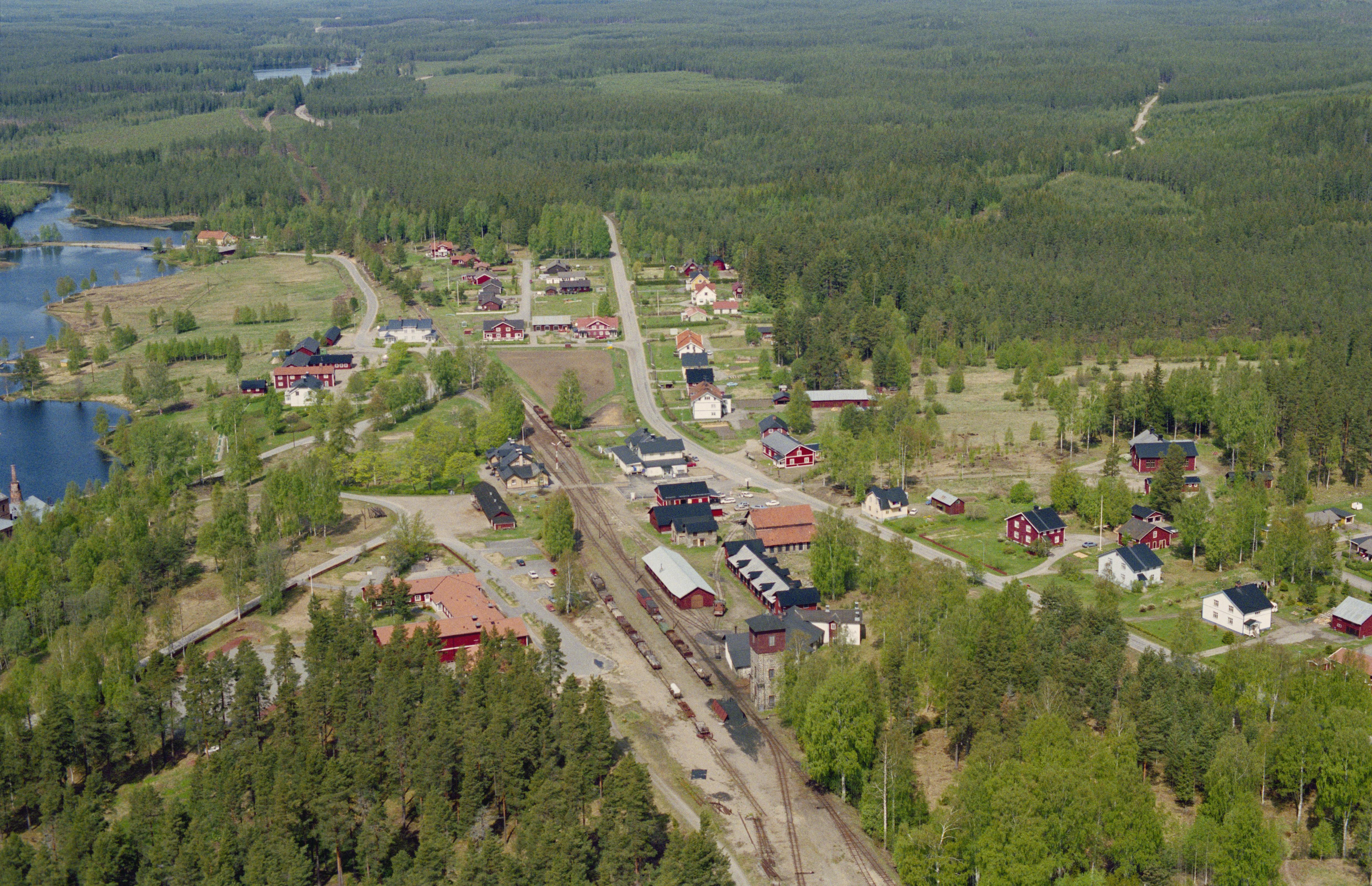 Beskrivning: Jädraås bruk vid Jädraån. Bruksherrgård, hytta, smedja, järnvägsstation (under bildens mitt) m.m. Jädraås herrgård till vänster om bildens mitt. Bilden är tagen mot (väderstreck): NV