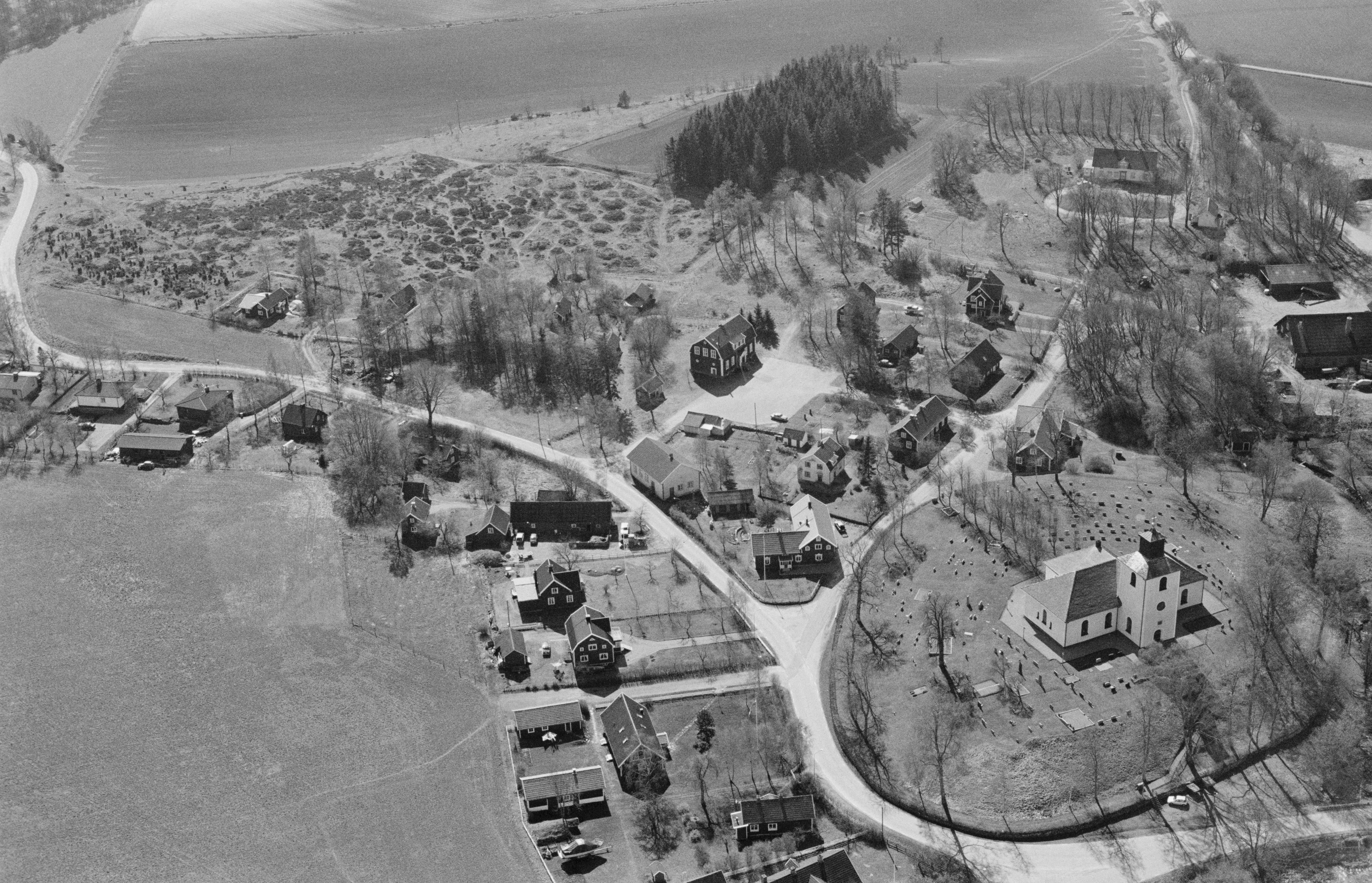 Beskrivning: Dimbo kyrkby. Gravfält RAÄnr Dimbo 6:1 vid bildens mitt och Dimbo-Ottravads kyrka nere till höger. Bilden är tagen mot (väderstreck): SSV