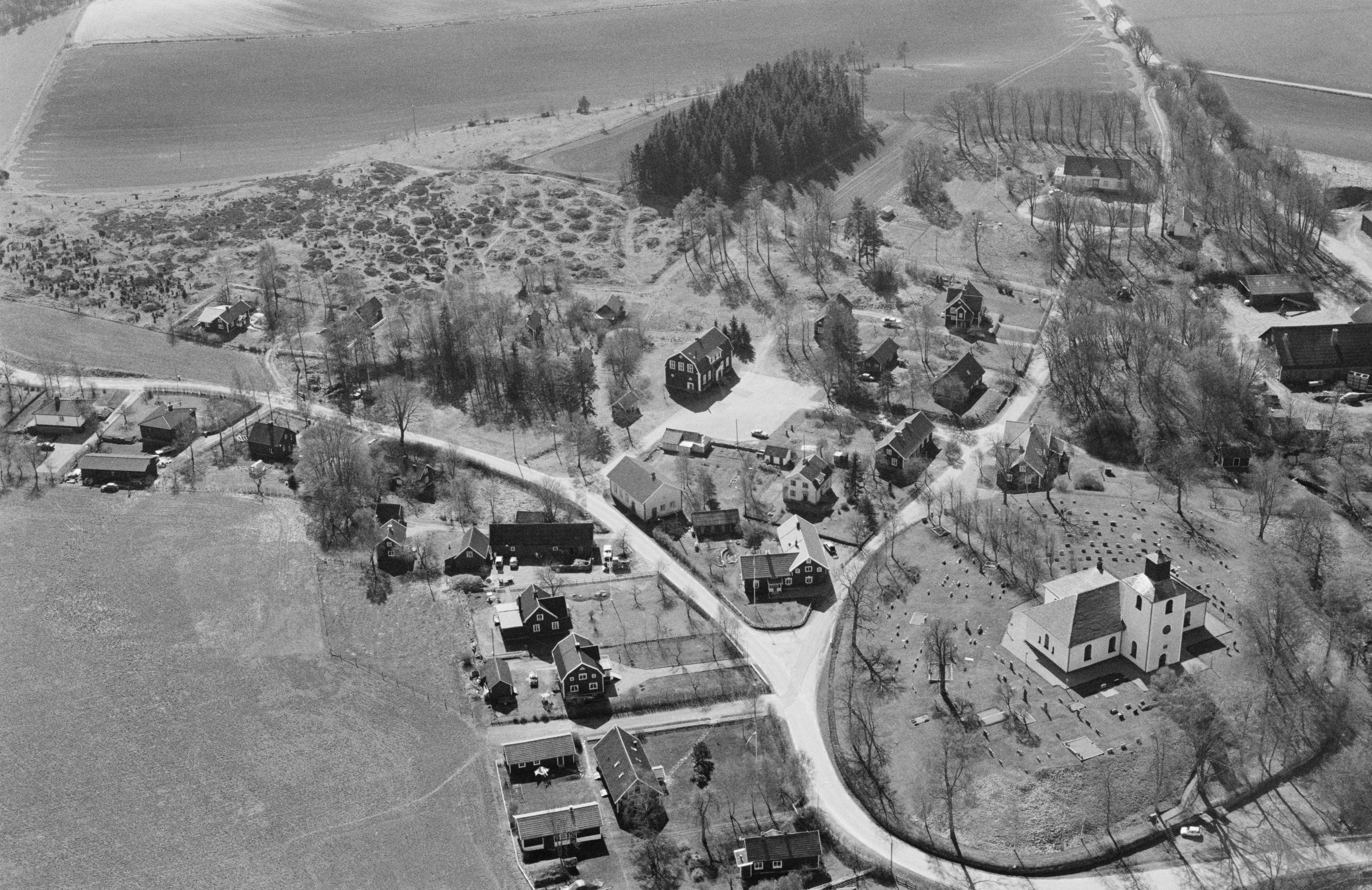 Beskrivning: Dimbo kyrkby. Gravfält RAÄnr Dimbo 6:1 vid bildens mitt och Dimbo-Ottravads kyrka nere till höger. Bilden är tagen mot (väderstreck): SSV