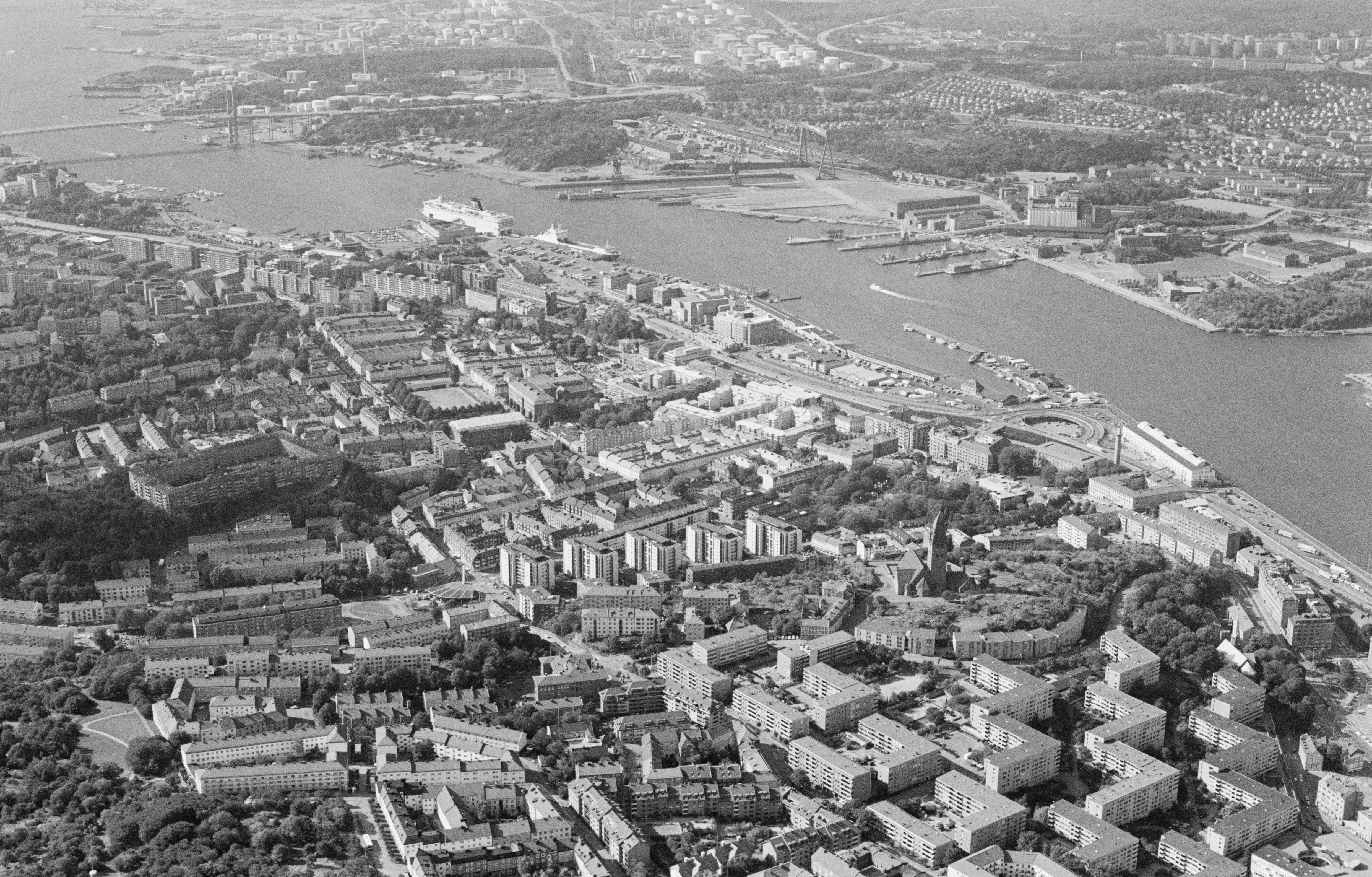Beskrivning: Masthugget, en stadsdel vid Göta älv i Göteborgs stad. Masthuggskyrkan nere till höger om bildens mitt. Bilden är tagen mot (väderstreck): SV