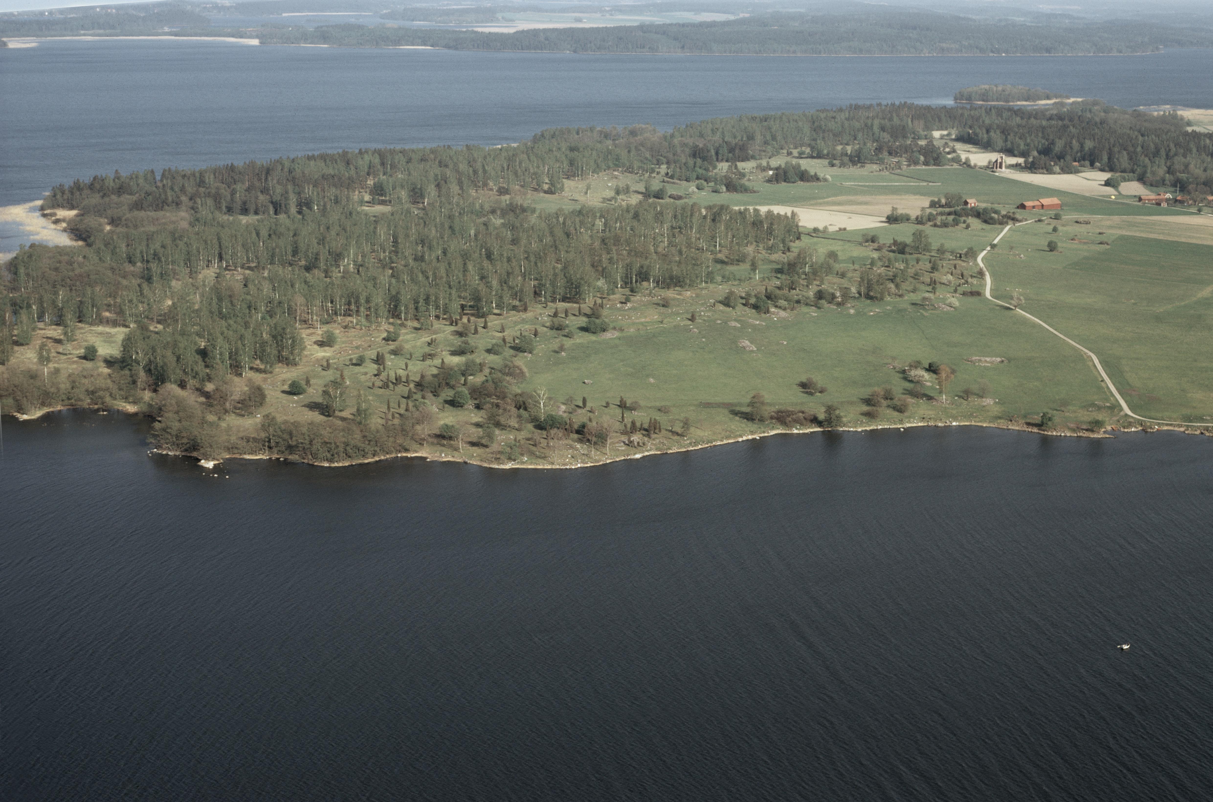 Beskrivning: Fornlämningsområdet Birka på Björkö i Mälaren. Norra delen av ön i området Hemlanden och Svarta jorden RAÄnr Adelsö 118:1 vid Stadsvallen Adelsö 119:1-2 m.fl. Till höger om bildens mitt Björkö by och Ansgarskapellet. Bilden är tagen mot (väderstreck): SO