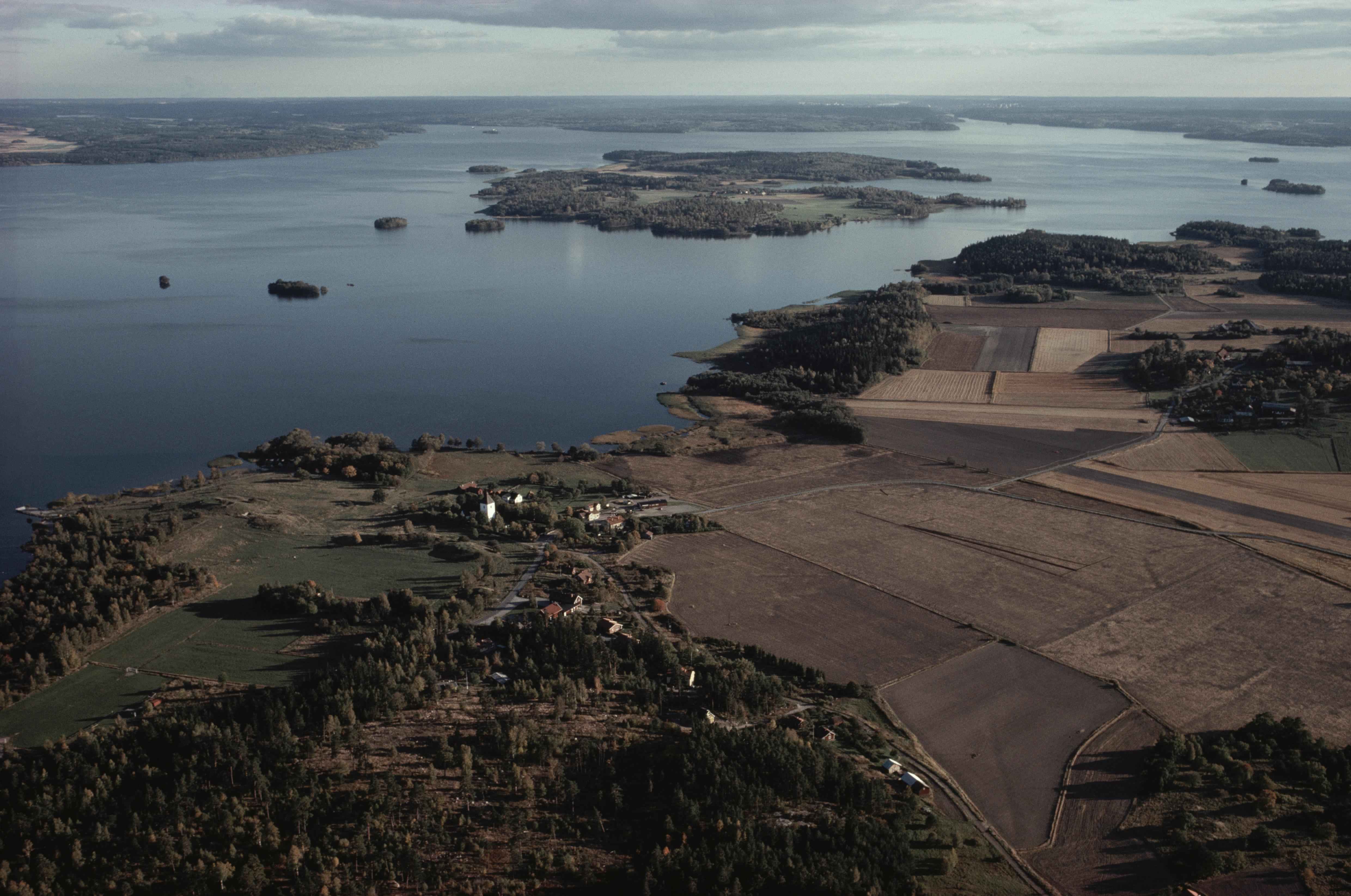 Beskrivning: Fornlämningsområdet Hovgården RAÄnr Adelsö 46:2 på Adelsön vid Hovgårdsfjärden i Mälaren. Alsnö hus RAÄnr Adelsö 47:1, Adelsö kyrka, Kungshögarna Adelsö 48:1-6 m.fl. I bildens övre del ön Björkö-Birka. Bilden är tagen mot (väderstreck): S