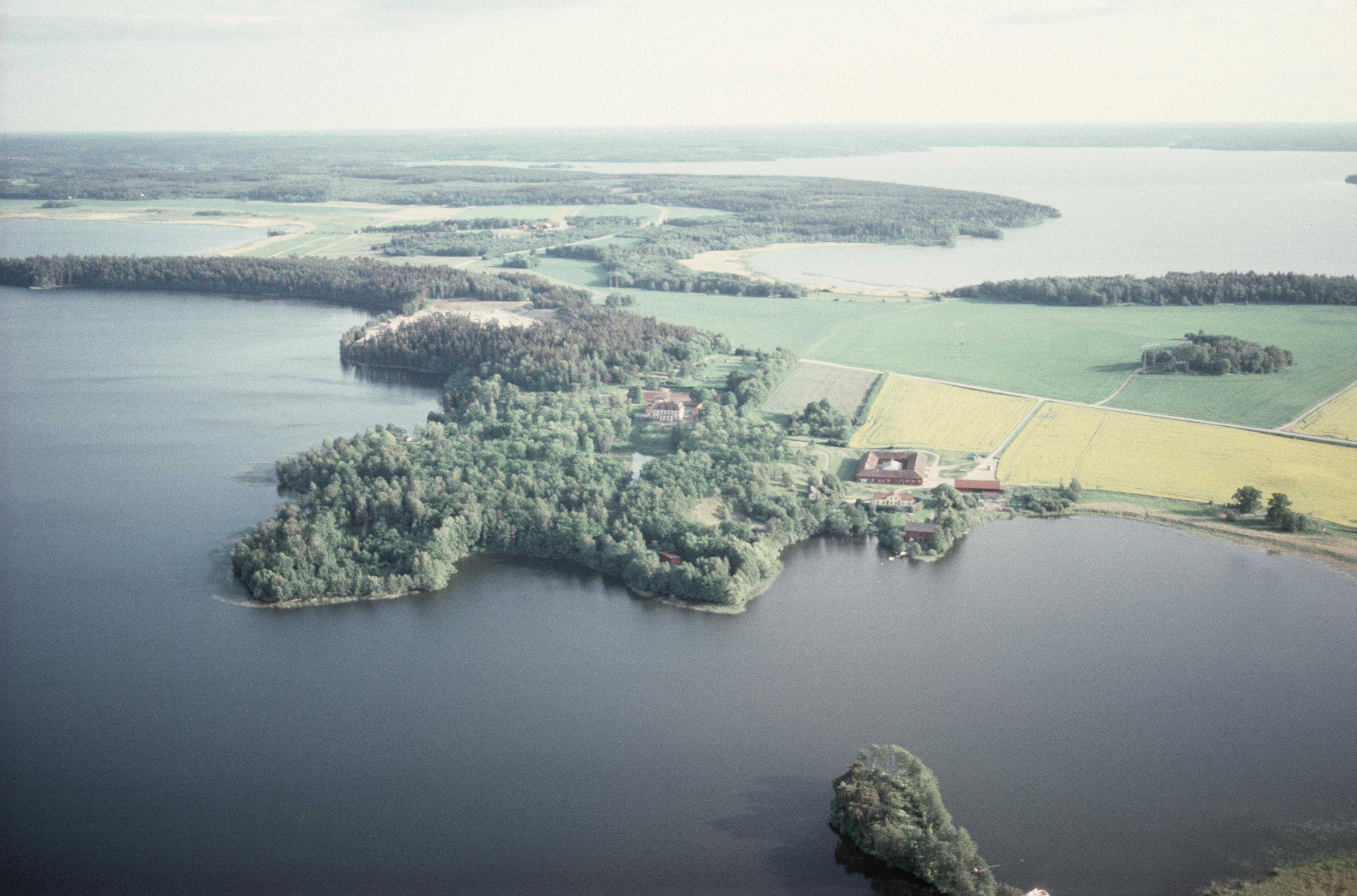 Beskrivning: Munsön i Mälaren, området Kärsön vid fjärden Långtarmen. I bildens nedre del viken Fladen som markerar gränsen mot socknet Munsö (i bildens nedre kant). Vid bildens mitt Kärsö herrgård (skrivs även Kersö herrgård) byggnadsminne RAÄnr Ekerö 199:1. Till vänster över bildens mitt Huvududden mot Hovgårdsfjärden. Bilden är tagen mot (vädersträck): SSV