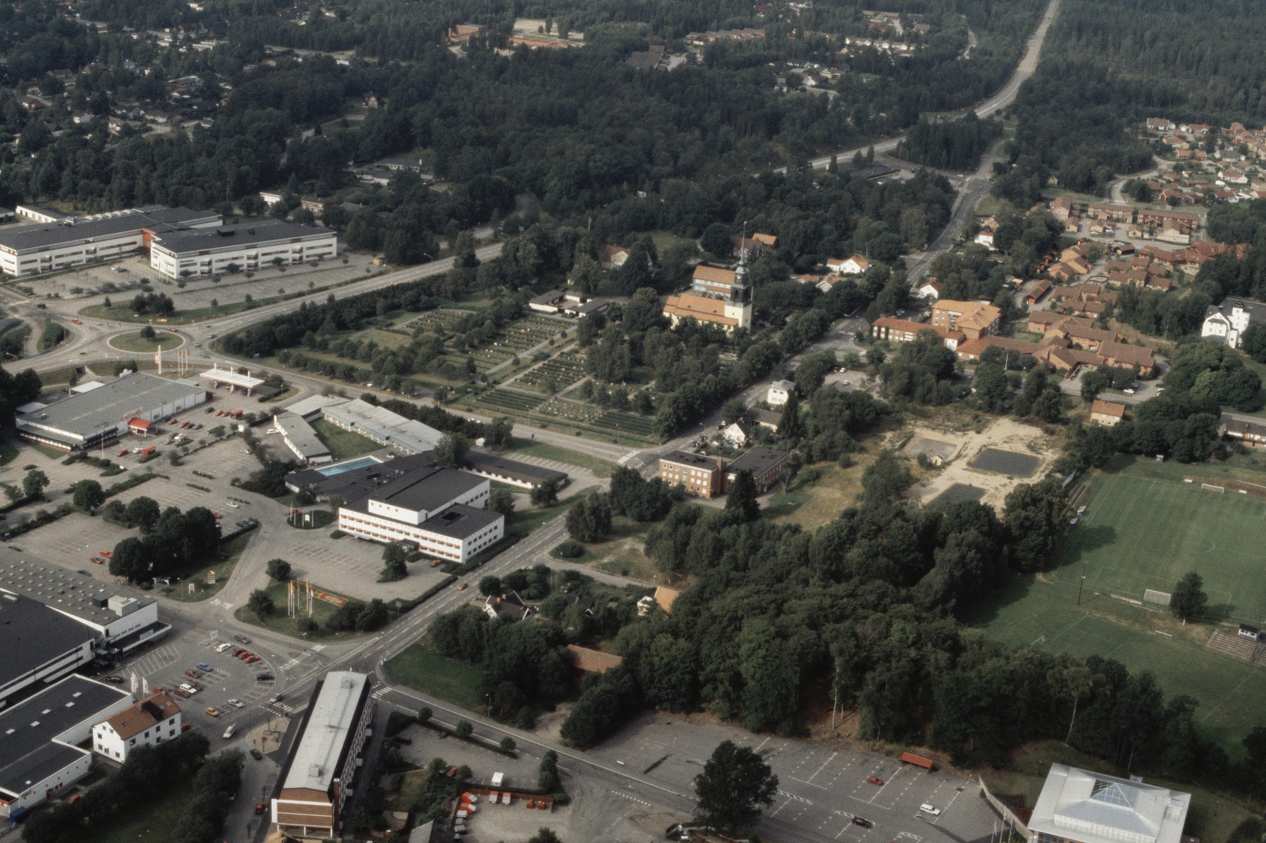 Beskrivning: Älmhults tätort (i tidigare Älmhults socken). Planmässigt uppbyggt järnvägssamhälle. Älmhults kyrka vid bildens mitt. Bilden är tagen mot (väderstreck): VSV