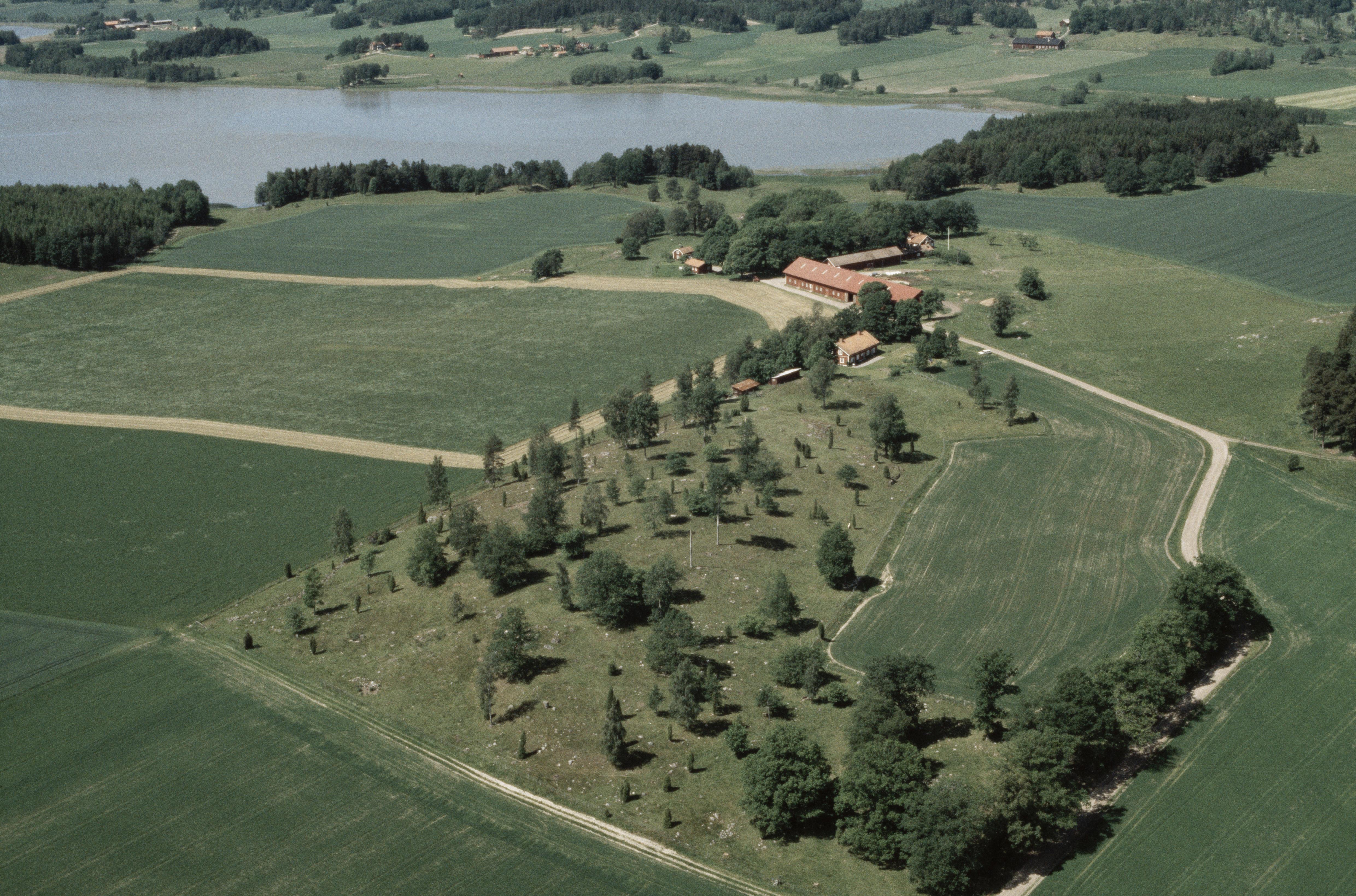 Beskrivning: Gravfält RAÄnr Spelvik 5:1. Landshammars gård vid sjön Eknaren. Bilden är tagen mot (väderstreck): NV