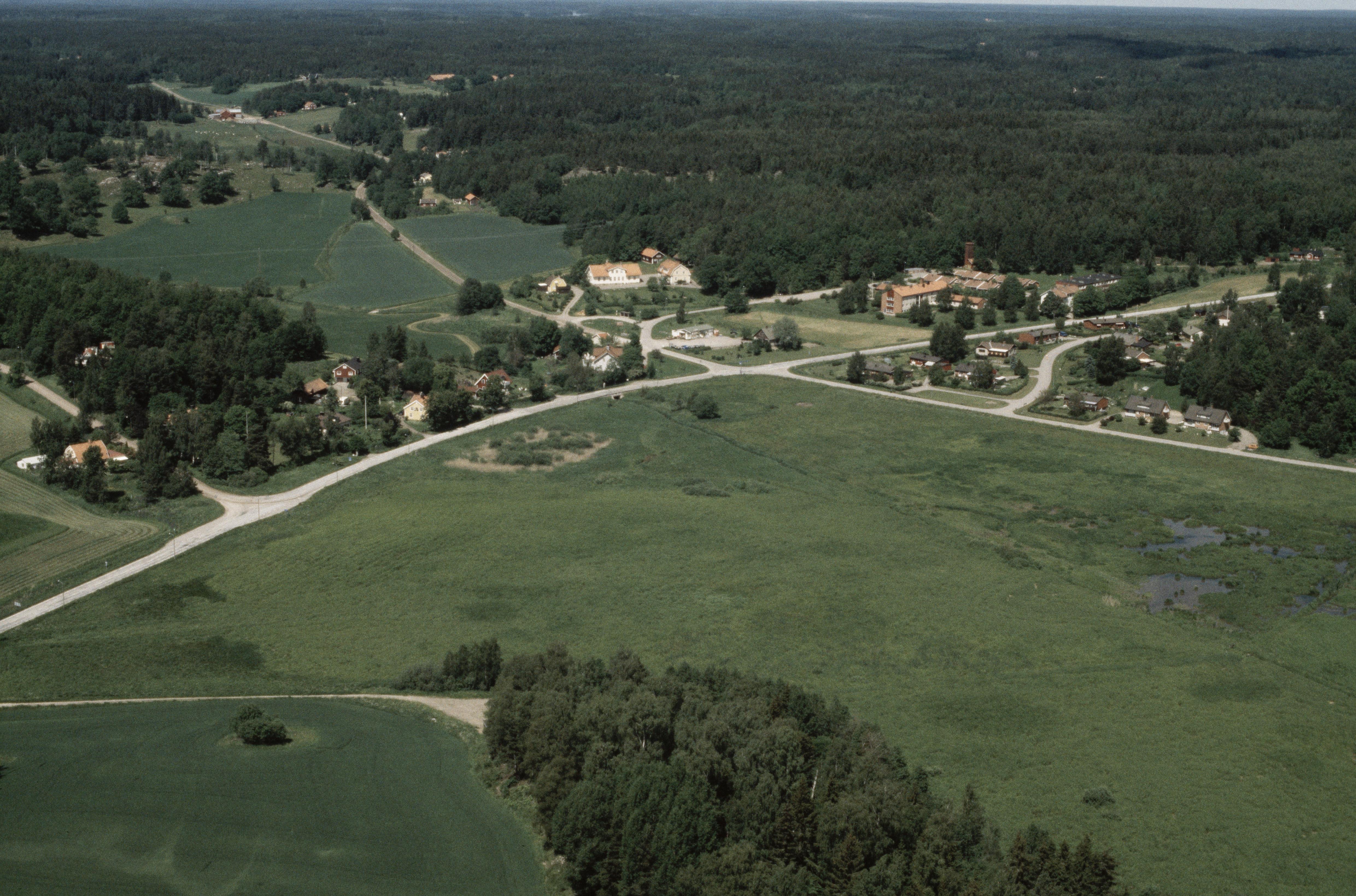 Beskrivning: Aspa gästgivaregård till vänster om bildens mitt. Nere till vänster Tingshögen RAÄnr Ludgo 62:1. I bildens övre del gränsen mellan två riksintressen, "D47 - Lid - Runtuna - Spelvik - Ludgo ? Lästringe - Bogsta" och "D43 - ?Eriksgatan? - Önnersta - Penningby". Bilden är tagen mot (väderstreck): NNV