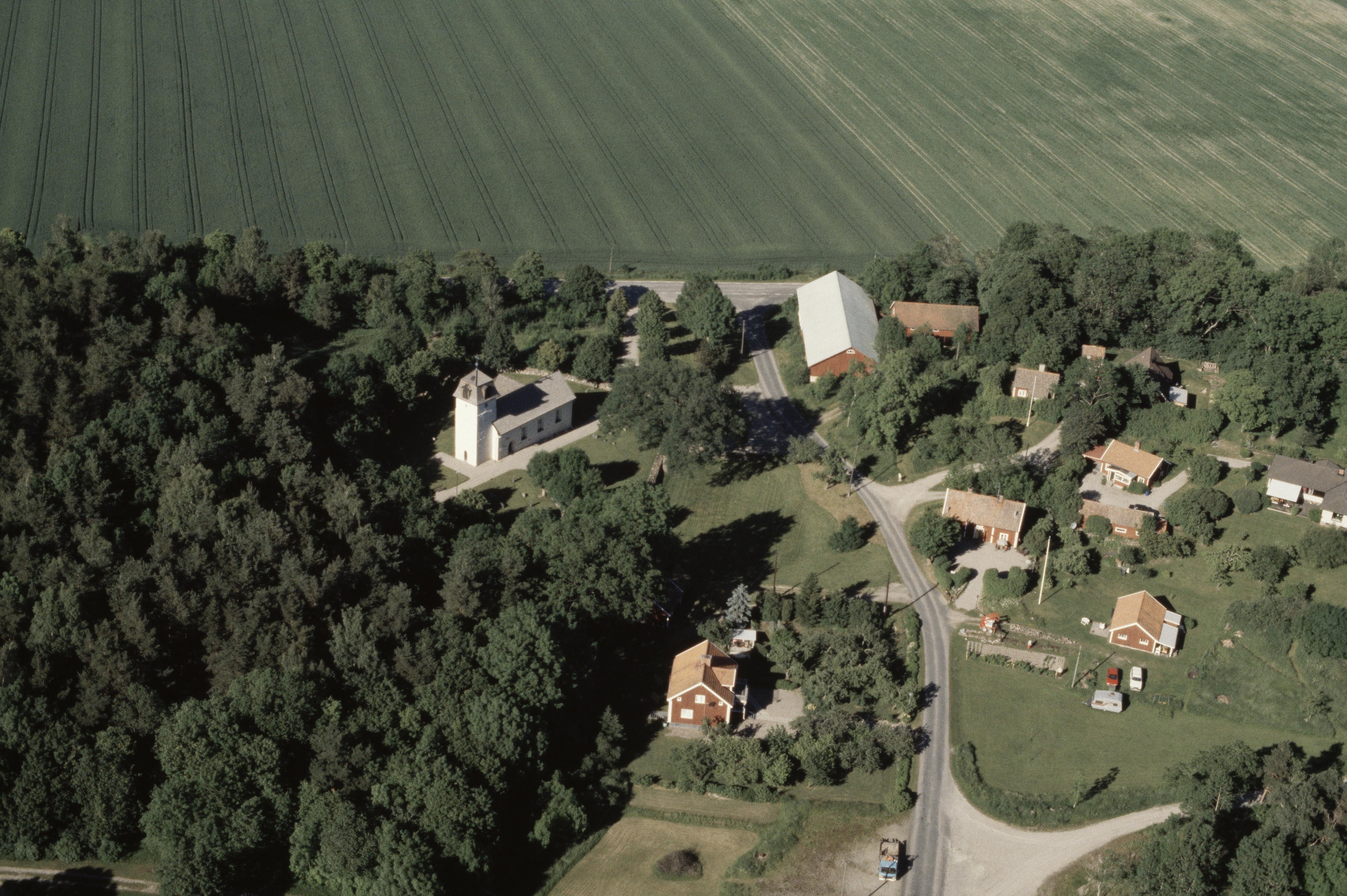 Beskrivning: Hammarby kyrka och kyrkby. Bilden är tagen mot (väderstreck): NO